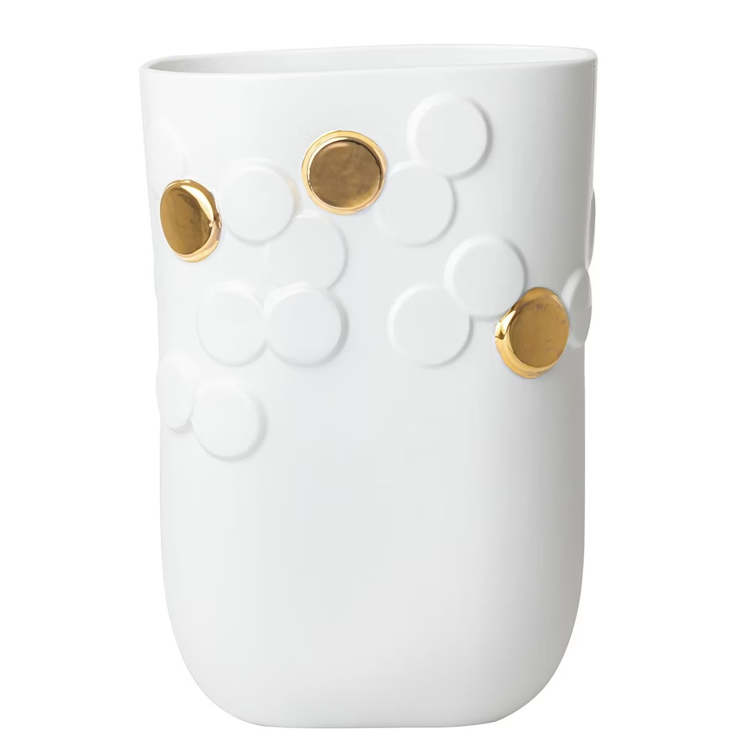 Die Vase Goldener Punkt von Räder, die aus unglasiertem Porzellan besteht, weist eine spannende Reliefstruktur auf, die stellenweise mit goldenen Details durch die Decal-Schiebefolientechnik verziert wurde. Die zufällig angeordneten Punkte, deren Relief unterschiedlich stark ausgearbeitet wurde, erschaffen eine spannende Optik. Die goldenen Details lassen die Vase besonders edel und festlich wirken. Ob als einzelner Blickfang oder in Kombination mit einer oder mehreren Vasen in unterschiedlichen Höhen aus der gleichen Serie – die Vase ist auch ein tolles Geschenk, dass zum dekorieren mit unterschiedlichen Zweigen oder Blumen einlädt. Durch ihre ovale Form passt sie auch perfekt auf schmale Fensterbänke. In der großen Варианты ist die Vase 32 cm hoch, 22 cm breit und 14 cm tief.