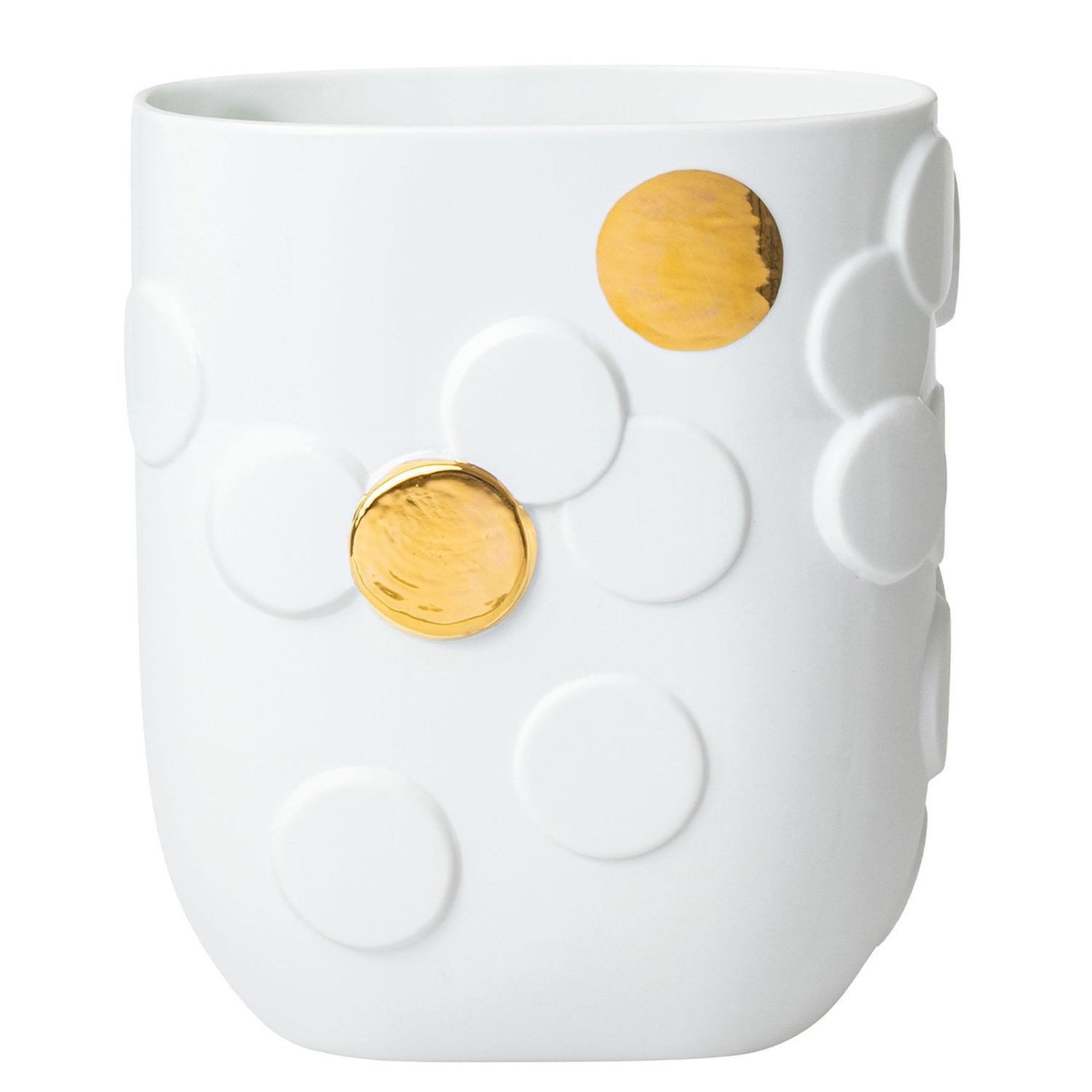 Die Vase Goldener Punkt von Räder, die aus unglasiertem Porzellan besteht, weist eine spannende Reliefstruktur auf, die stellenweise mit goldenen Details durch die Decal-Schiebefolientechnik verziert wurde. Die zufällig angeordneten Punkte, deren Relief unterschiedlich stark ausgearbeitet wurde, erschaffen eine spannende Optik. Die goldenen Details lassen die Vase besonders edel und festlich wirken. Ob als einzelner Blickfang oder in Kombination mit einer oder mehreren Vasen in unterschiedlichen Höhen aus der gleichen Serie – die Vase ist auch ein tolles Geschenk, dass zum dekorieren mit unterschiedlichen Zweigen oder Blumen einlädt. Durch ihre ovale Form passt sie auch perfekt auf schmale Fensterbänke. In der kleinen Варианты ist die Vase 21,5 cm hoch, 19 cm breit und 12 cm tief.