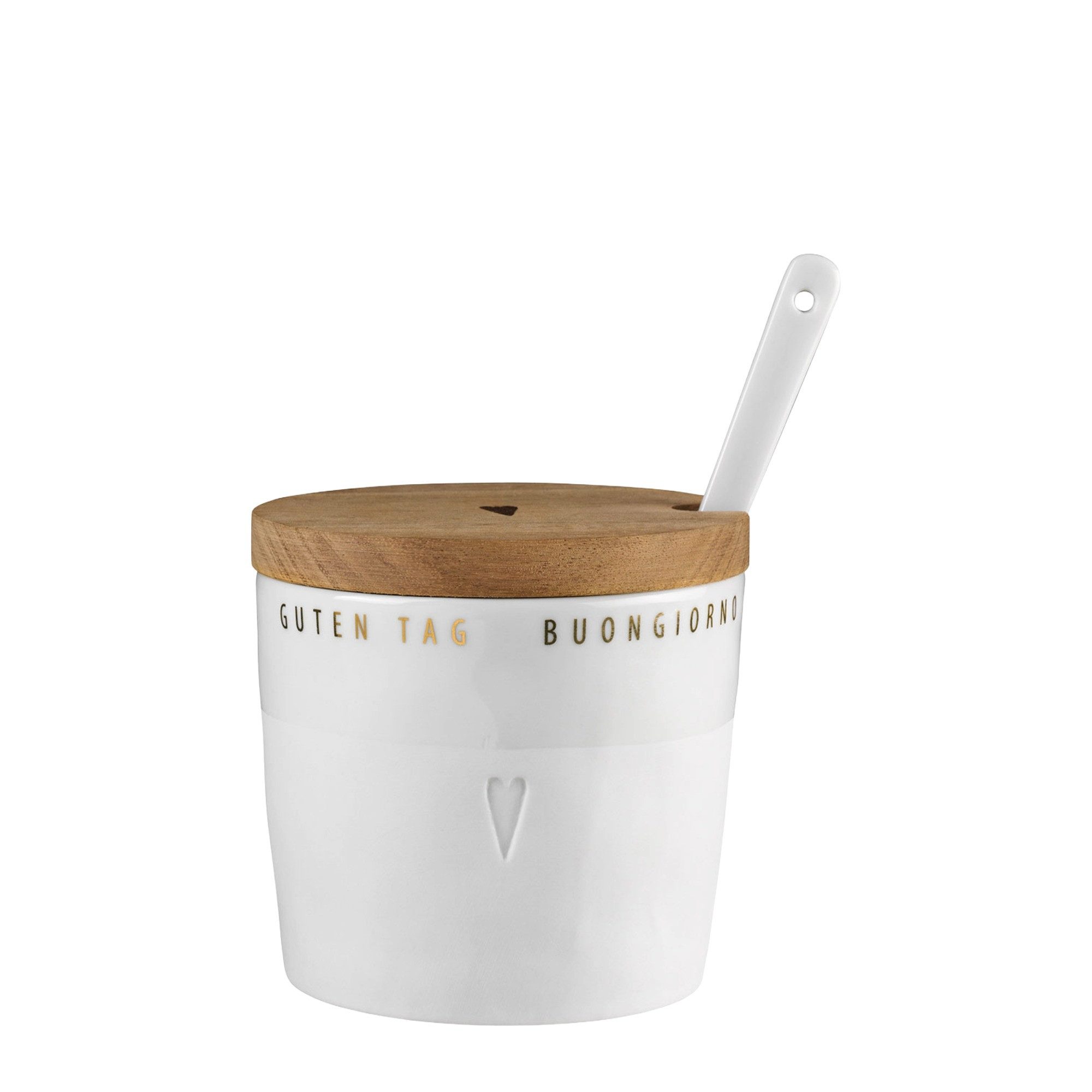 Die räder Zuckerdose aus Porzellan vereint minimalistisches Design mit einem Hauch von Natürlichkeit. Ihr schlichter, weißer Korpus wird durch die feine Glasur akzentuiert, während der Deckel aus Akazienholz einen warmen Kontrast bildet. Mit ihrer klaren Formsprache passt sie perfekt zu modernem wie auch klassischem Geschirr.