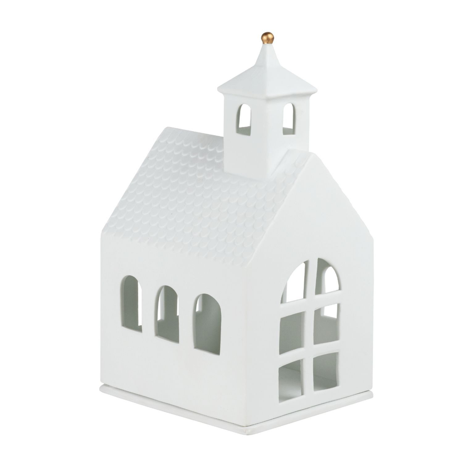 Mit viel Liebe zum Detail bringen die Lichthäuser von Räder die Welt zum Leuchten. Seit mehr als 25 Jahren bereichern die kleinen Porzellan-Häuser das Меню, dabei erzählt jedes Haus eine ganz eigene Geschichte, die sich hinter von Hand ausgeschnittenen, beleuchteten Fenstern und erhellten Türen versteckt. Gefertigt aus unglasierter, weißer Keramik lassen sich ganze Straßenzüge kombinieren, die gemeinsam um die Wette strahlen. Das mittelgroße Lichthaus ist im Stile einer kleinen Kirche gehalten und verfügt über einen kleinen Glockenturm mit goldener Spitze. Das Lichterhaus ist 22,5 cm hoch, 12,5 cm breit und 11 cm tief. Es steht auf einer passgenauen Bodenplatte, welche Platz für ein Teelicht bietet.