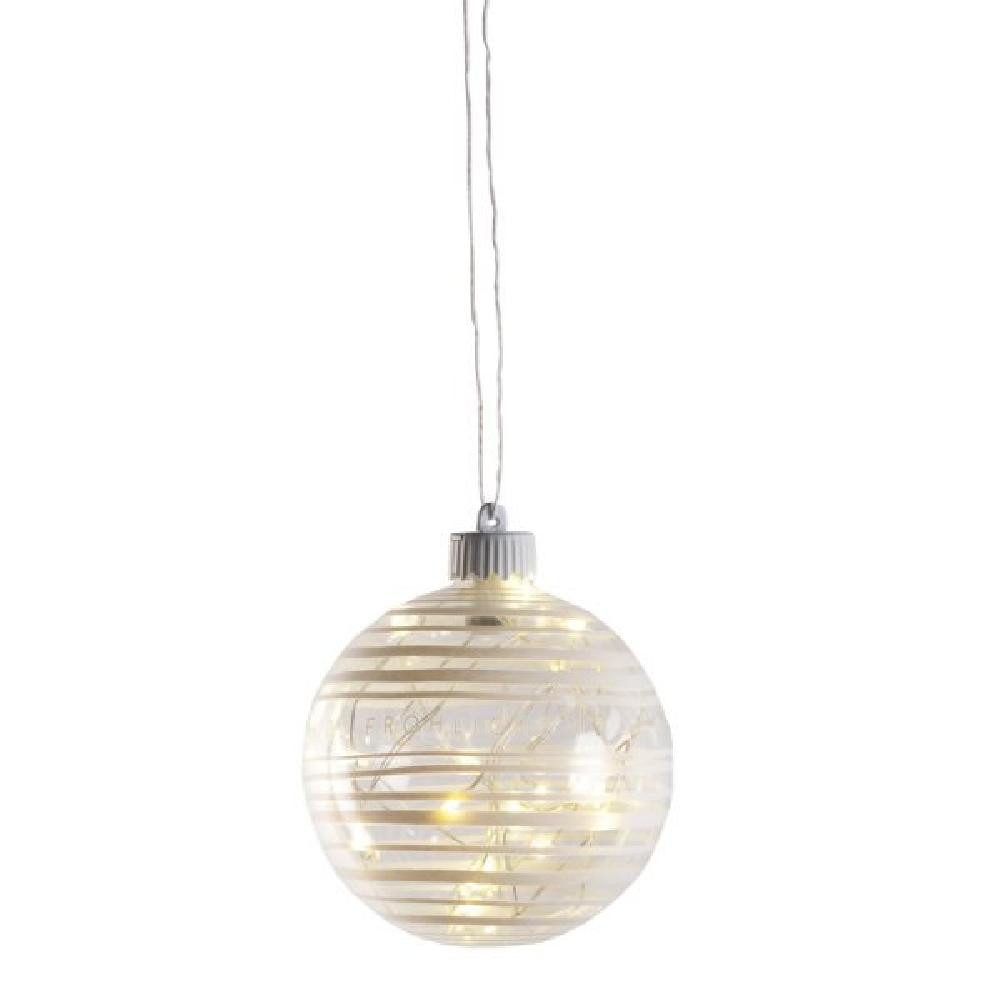LED Kugel aus Glas mit weißem Decal, silberfarbenem LED-Draht und weißem Baumwollband