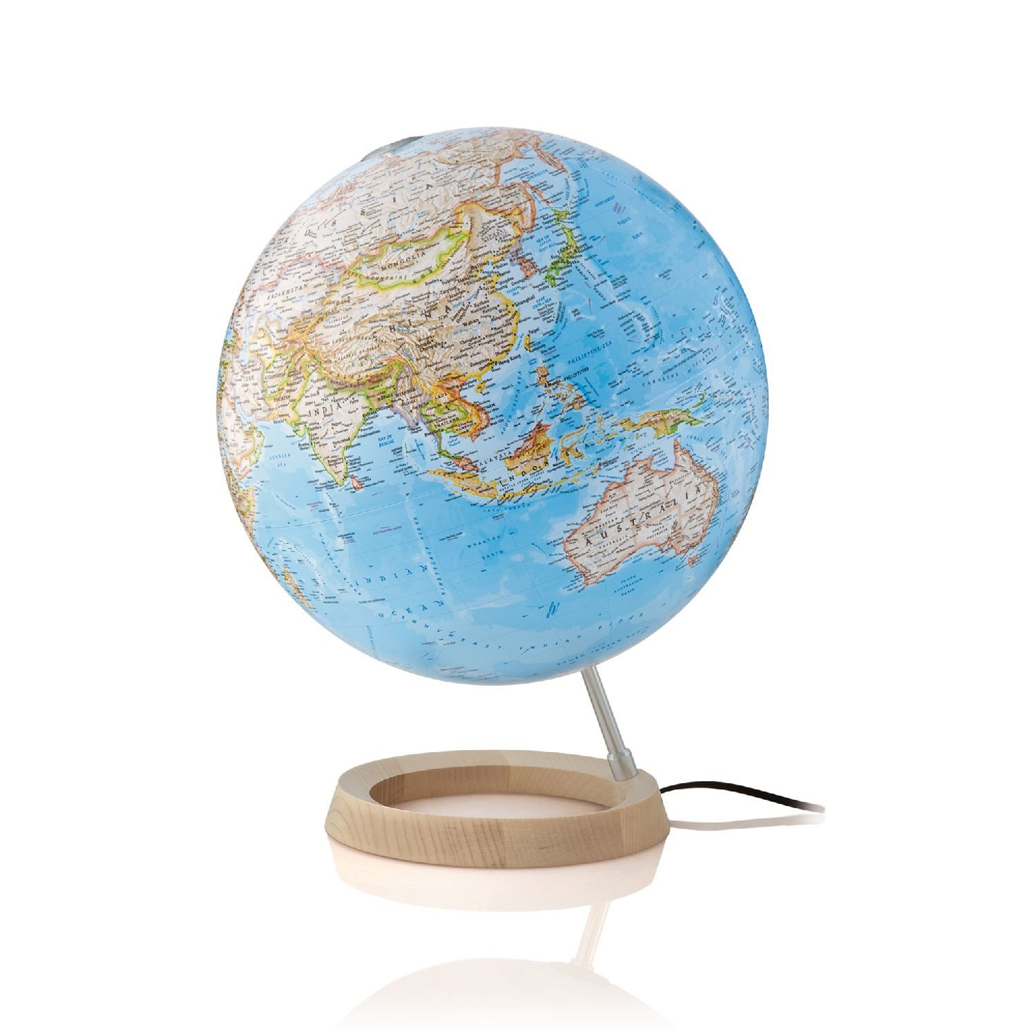 Beleuchteter Tischglobus von National Geographic ringförmiger Fuß aus Ahornholz, Schrägstütze aus Aluminium die Globuskugel stellt die durch die National Geographic Maps Division gezeichnete Kartographie "Classic" mit blauem Meer dar, diese ist im Wesentlichen politisch, physische Informationen sind durch Schattierungen angedeutet Beschriftung in deutscher Sprache Kugeldurchmesser 30 cm Gesamthöhe 40 cm sparsames LED-Leuchtmittel (2 W) Über 2.000 geografische Namen sind auf diesem Leuchtglobus verzeichnet. Der Text ist übersichtlich und jedes Land in einer anderen Farbe dargestellt, mit einem dunkleren Farbton an den Grenzen, um die politische Karte stärker hervorzuheben. In den Ozeanen sind unterseeische Gräben und Becken bezeichnet. Rote und blaue Pfeile kennzeichnen die wichtigsten warmen und kalten Meeresströmungen. Unterschiedliche Blautöne lassen die Meerestiefen erkennen, Schattierungen kennzeichnen die Gebirgszüge auf den Landmassen. Mit dem Design dieses Gestells ist dem dänischen Team von Tools durch eine klare Formensprache und die Leichtigkeit der Proportionen eine wahrhafte Neuinterpretation des Themas Globus gelungen. Weg von der prototypischen Ansicht des Globus, bei dem die Kugel in einen Meridian eingehängt wird, zeichnet sich das Modell Neon durch ein innovatives Design des Gestells aus. Durch die schlanke Form der Achse aus hochwertigem Aluminium scheint die Kugel förmlich über dem elegant gezeichneten hellen Holzring aus Ahorn zu schweben. Die Neigung der Achse entspricht selbstverständlich der tatsächlichen Neigung der Erdachse. Es handelt sich um einen außerordentlich eleganten Einrichtungsgegenstand, der das Wohnambiente mit Stil und Einzigartigkeit bereichert. Der Holzfuß aus Ahorn verleiht dem Globus eine Identität, die ihn in jeder Hinsicht als Einrichtungsgegenstand von hochwertigem Design kennzeichnet.