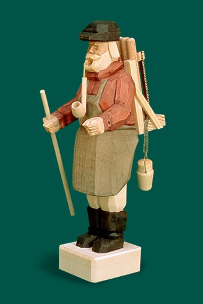 Räucherfigur Holzmacher geschnitzt Dieser tolle Räuchermann hat eine Размер von 18 cm. Die Figur steht frei auf einem Sockel und hat eine Funktion für normale Räucherkerzen. Der Holzmacher trägt eine Jacke und eine Hut auf dem Kopf. Er hat einen Stab in der Hand, die Pfeife im Mund und auf dem Rücken die Holzkraxe. Der Räuchermann ist vollständig aus Holz gefertigt und braun gestaltet. Das Unterteil mit dem Boden lässt sich abnehmen und darauf wird die Räucherkerze gestellt. Всеs wird in verschiedenen Arbeitsschritten komplett in Seiffen in einem kleinen Betrieb hergestellt Höhe 18cm NEU |