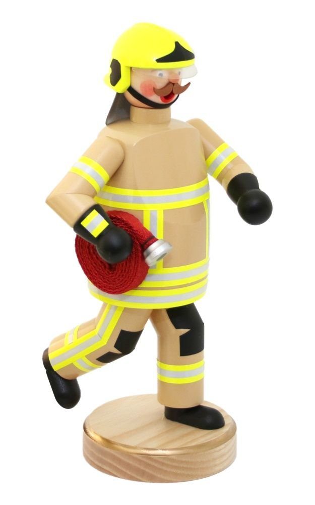 Räuchermann Feuerwehrmann beige Dieser tolle Räuchermann hat eine Размер von 23 cm. Die Figur steht frei auf einem Sockel und hat eine Funktion für normale Räucherkerzen. Der Feuerwehrmann trägt seine beige Einsatzuniform mit Helm auf dem Kopf und hält in der Hand einen Schlauch. Der Räuchermann ist vollständig aus Holz gefertigt und bunt gestaltet. Das Unterteil mit dem Boden lässt sich abnehmen und darauf wird die Räucherkerze gestellt. Всеs wird in verschiedenen Arbeitsschritten komplett in Seiffen in einem kleinem Betrieb mit langer Tradition hergestellt Höhe 23cm NEU |