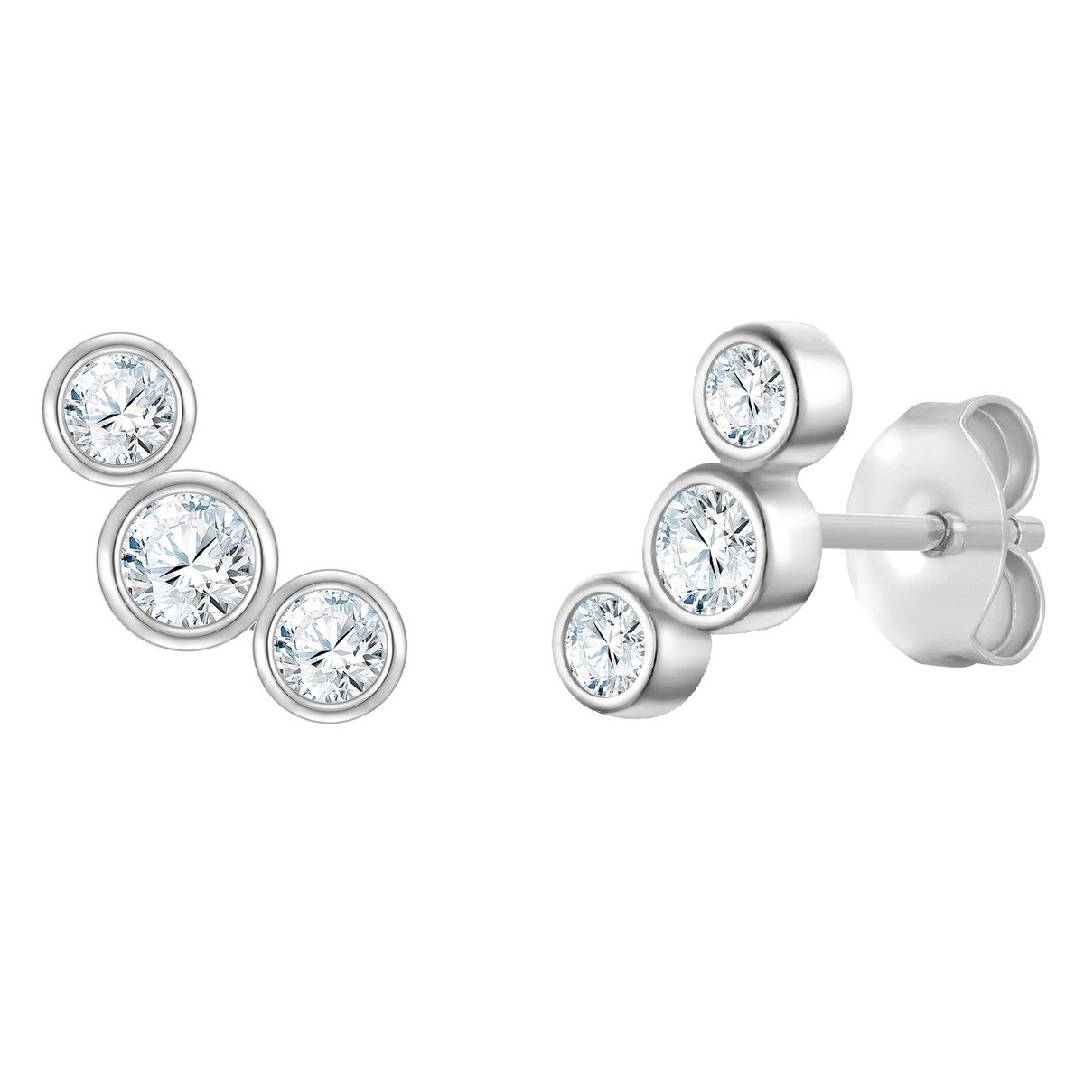 Klein aber fein: Ohrringe in geschmackvollen Geo-Looks sind aus den Schmuckkästchen nicht wegzudenken. Diese Ohrstecker des Labels Rafaela Donata setzen auf ein sorgfältig arrangiertes Zirkonia-Trio: Die filigrane Kaskade aus Kristallen in Zargenfassungen ist funkelndes Unterstatement am Ohr - dreifach schön! Die eleganten Stecker sind aus 925er Sterling Silber gefertigt und mit einem Rhodium-Finish vor dem Anlaufen geschützt. Ein Steckverschluss macht das An- und Ablegen einfach. Das Ergebnis ist ein vielseitig kombinierbares Accessoire in Juweliersqualität für alle Fans der kühl glänzenden Edelmetallnuance Silber.