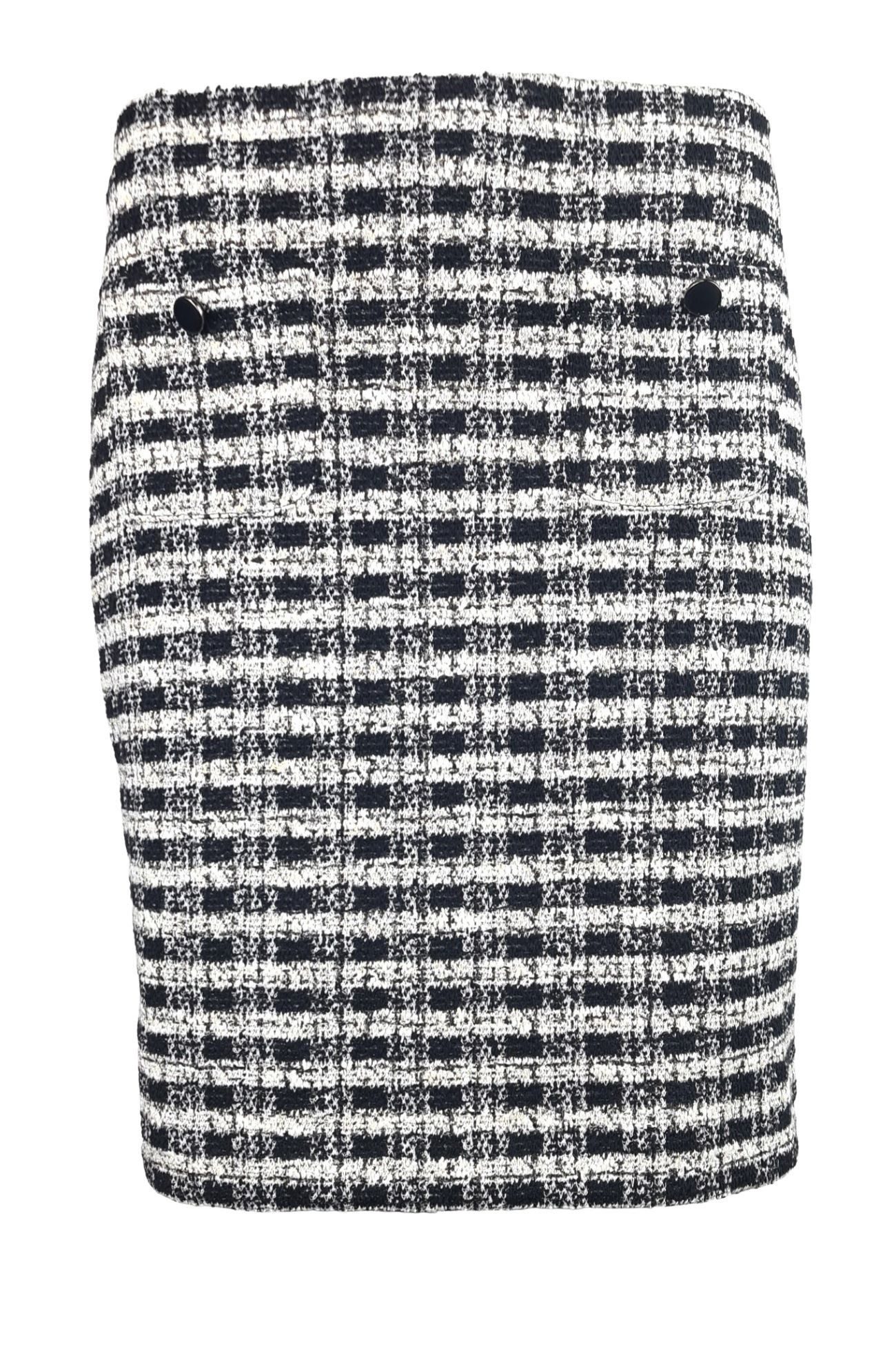 Die aufgesetzten Taschen vorne, verziert mit dekorativen Knöpfen, verleihen ihm einen modischen Touch. Der raffinierte Jersey mit Bouclé-Effekt sorgt für eine interessante Textur, während die dezent glänzenden Lurex-Fäden dem Rock einen Hauch von Eleganz verleihen. Dank des elastischen und herrlich weichen Materials bietet er nicht nur einen tollen Look, sondern auch hohen Tragekomfort.