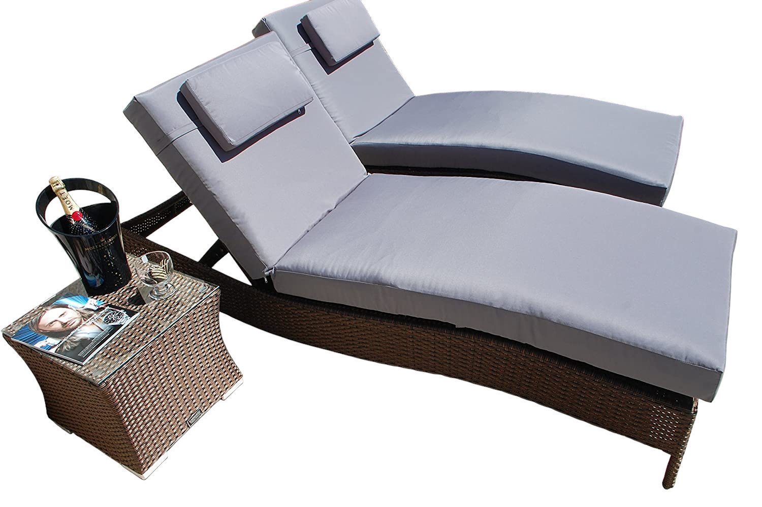 Lieferumfang | 2 XXL Liegen inkl. Polster 1 Beistelltisch inkl. ESG-Sicherheitsglasplatte |