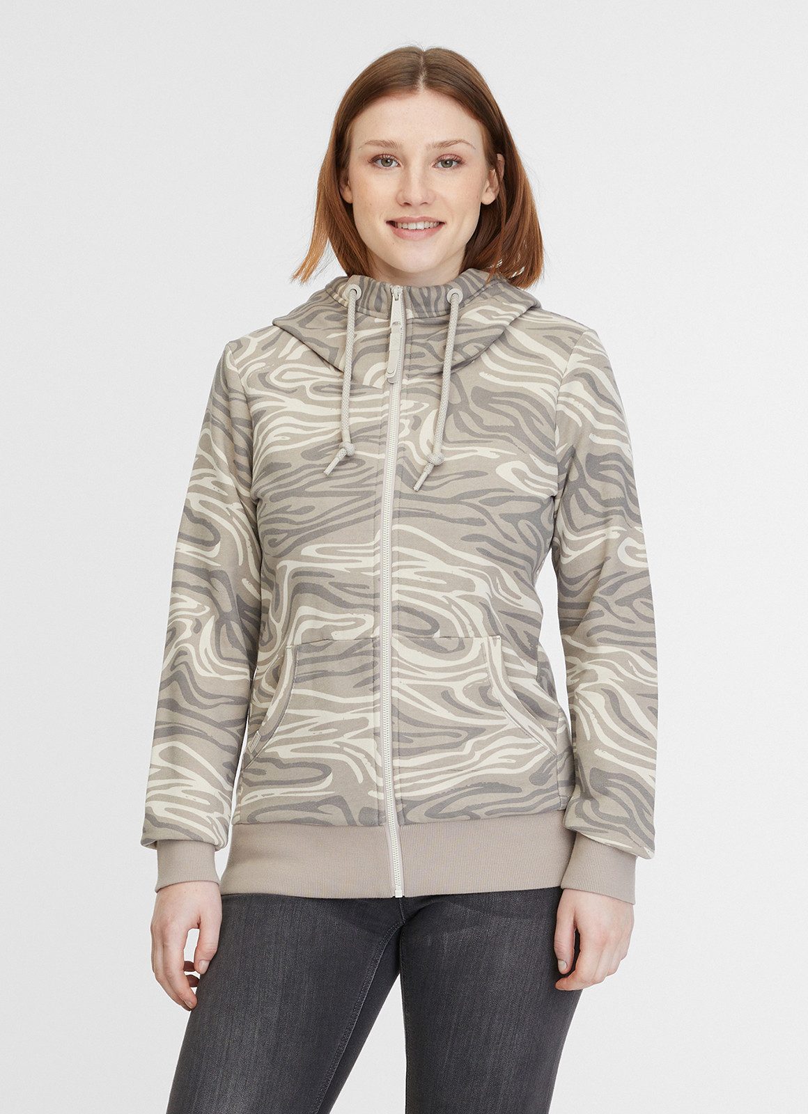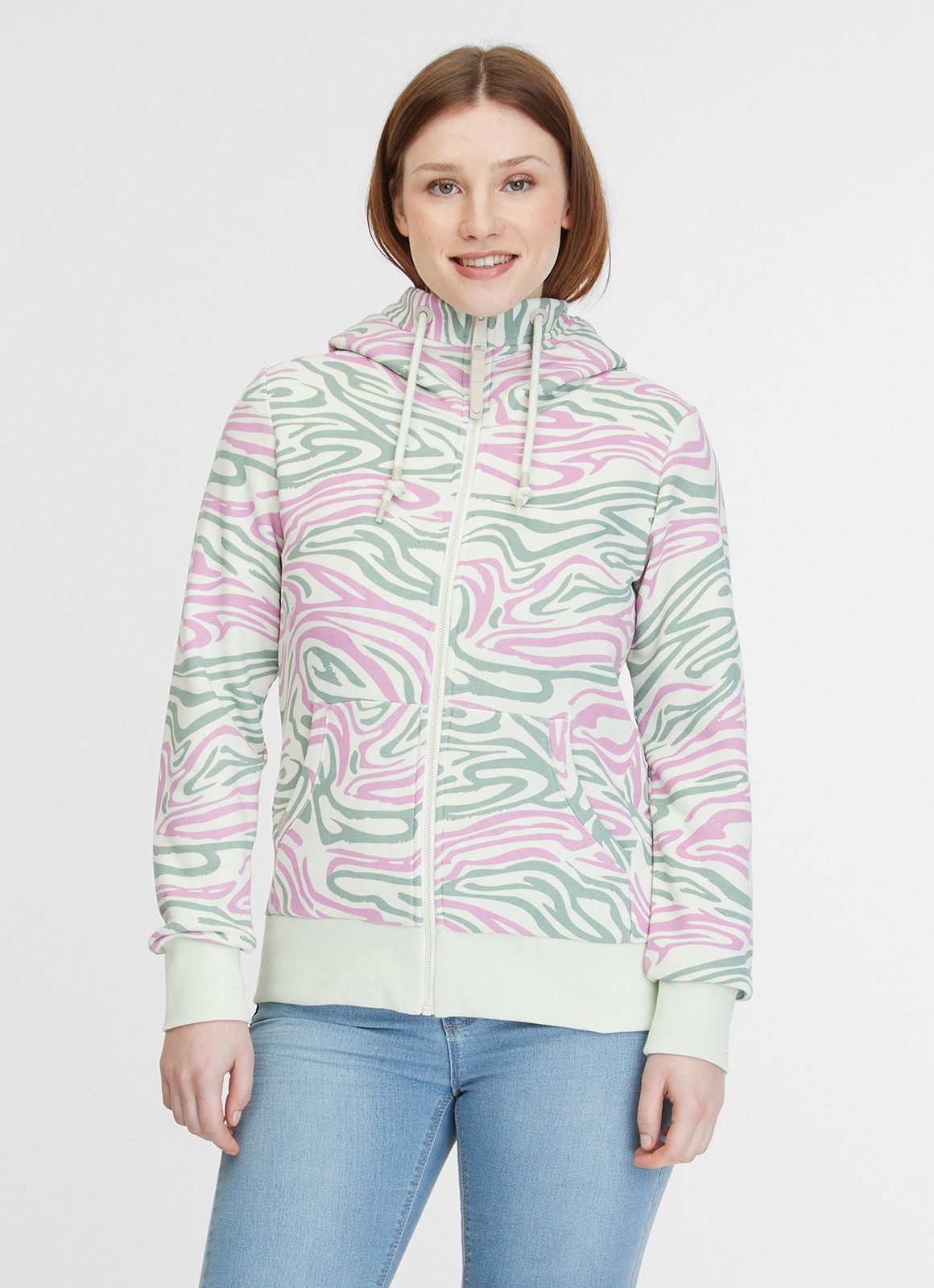 Die bequem geschnittene Sweatjacke 'NESKIA PRINT ZIP' von ragwear kann dich das ganze Jahr begleiten. Mit hochgeschnittener Kapuze mit Kordel und den aufgesetzten Kängurutaschen überzeugt sie mit ihrem sportiven Look. Die breiten Rippstrickbündchen an den Ärmeln und dem Saum sorgen für guten Halt, der weiche Sweat ist einfach nur gemütlich und angenehm zu tragen. Eine Stofflasche am Reißverschluss erleichtert das Öffnen, auch wenn die Hände von einem Herbstsspaziergang kalt sind. Unser Tipp: Die etwas längere Jacke macht sich gut zu Skinny-Jeans oder engem Rock mit langem T-Shirt im Lagen-Look.