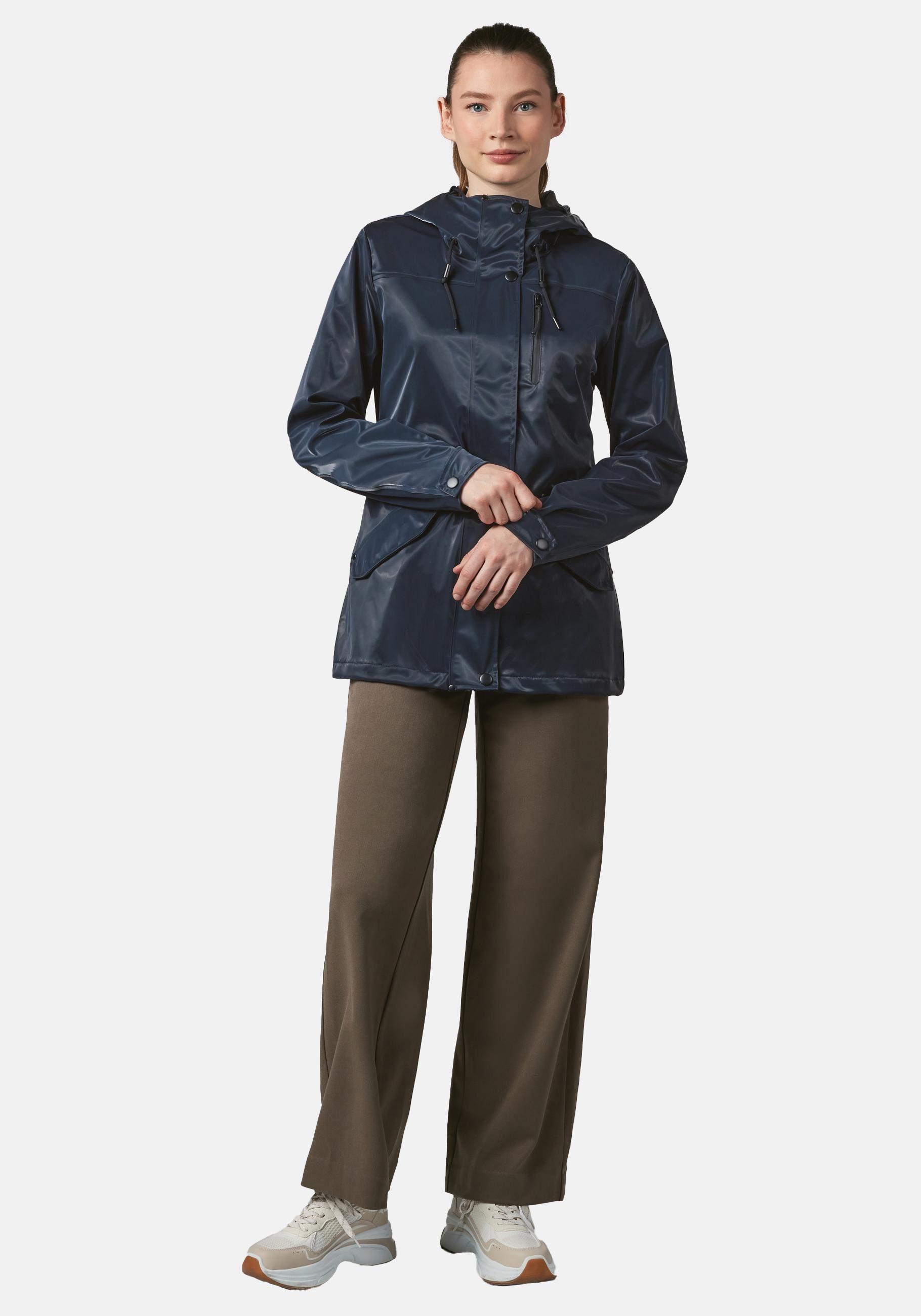 Robuste Damen Übergangsjacke in Shiny-Optik Verstellbare Kapuze mit Kordeln Hochschließender Kragen mit Druckknopf-Abdeckleiste Figurumschmeichelnder Schnitt bis über den Po 2 seitliche Pattentaschen mit Druckknöpfen Frontreißverschluss mit Kinnschutz Wasserdichte Brusttasche links Geschweißte Nähte Wasser- und winddicht (Wassersäule: 3.000 mm) Ärmelenden mit Druckknöpfen verstellbar Schonwaschgang bei 30°C