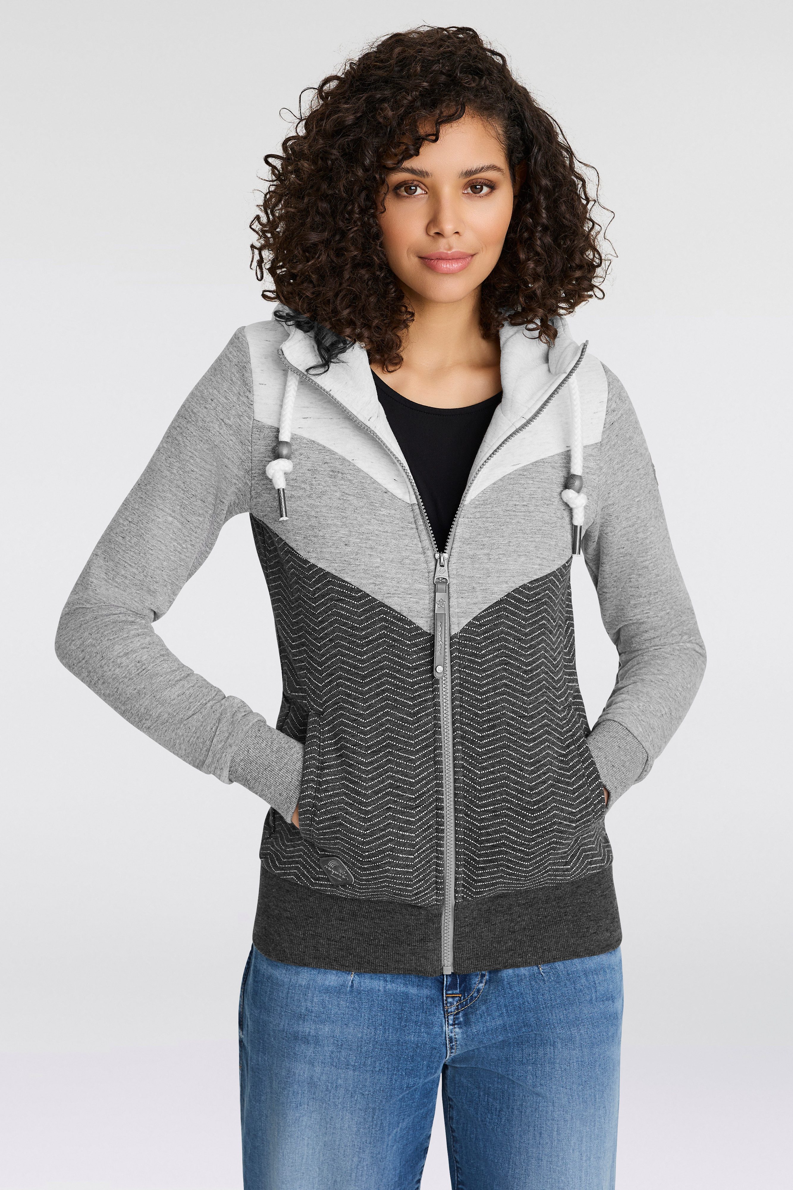 Motiviert und konzentriert geht es für Frauen mit der Sweatjacke im kontrastreichen Colorblock-Stil von Ragwear zum Sport oder einfach nur ins Freie. Sie hat einen durchgehenden Reißverschluss sowie eine Kapuze mit Kordelzug und farblich passendem Innenfutter. An den langen Ärmeln ist ein Rippbündchen. In der Kängurutasche gibt es Platz, um Hände aufzuwärmen oder Kleinigkeiten zu verstauen. Der Look wird mit einem innenliegenden Brandlabel, Kontrastbesätzen, einer Kordel, einem Kordelzug, einer Logoprägung, einem Logoschriftzug und einem Markenlabel aufgelockert. Die Sweatjacke ist bequem und sorgt für ein angenehmes Tragegefühl. Sie eignet sich für gemütliche Stunden auf dem Sofa oder einen Serien-Marathon.