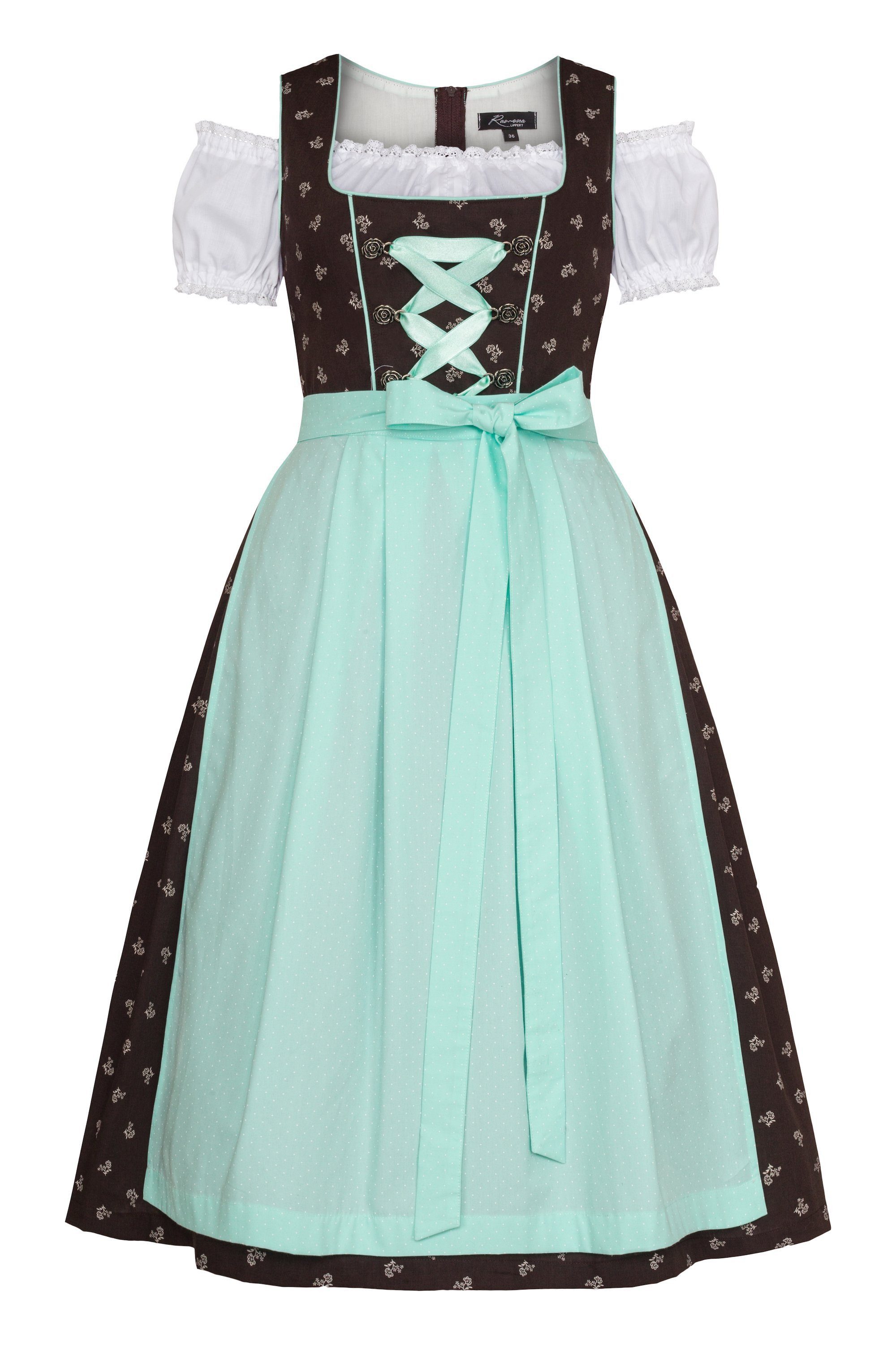 Das Dirndl Elisabeth ist ein wunderschönes Damendirndl, das mit seinem dunkelbraunen Stoff und den weißen Streublümchen sofort ins Auge sticht. Die Schürze in einem frischen Mintton mit weißen Punkten ist ein echter Hingucker und verleiht dem Dirndl eine gewisse Leichtigkeit. Die Длина des Dirndls beträgt 65 cm und ist somit perfekt für alle Frauen, die ein Dirndl suchen, das nicht zu kurz und nicht zu lang ist. Der Rock des Dirndls fällt wunderschön und umspielt die Beine auf eine feminine Art und Weise. Ein weiteres Highlight des Dirndls ist die praktische Rocktasche, die genügend Platz für alle wichtigen Dinge bietet, die man unterwegs braucht. Ob Handy, Geldbeutel oder Lippenstift - mit der Rocktasche hat man alles griffbereit und kann sich voll und ganz auf das Oktoberfest oder andere Festlichkeiten konzentrieren. Das Dirndl Elisabeth wird in der EU hergestellt und steht somit für eine hohe Qualität und faire Arbeitsbedingungen. Das Material des Dirndls besteht aus hochwertigen Stoffen, die angenehm auf der Haut liegen und eine lange Lebensdauer haben. Insgesamt ist das Dirndl Elisabeth ein absolutes Must-Have für alle Frauen, die auf der Suche nach einem hochwertigen und stilvollen Dirndl sind. Mit seiner überzeugenden Tonalität und seinem einzigartigen Design ist es das perfekte Kleidungsstück für das Oktoberfest, Hochzeiten oder andere festliche Anlässe. Material: Kleid und Bluse 65 % Polyester, 35 % Baumwolle Schürze 100 % Baumwolle Rocklänge 65 cm