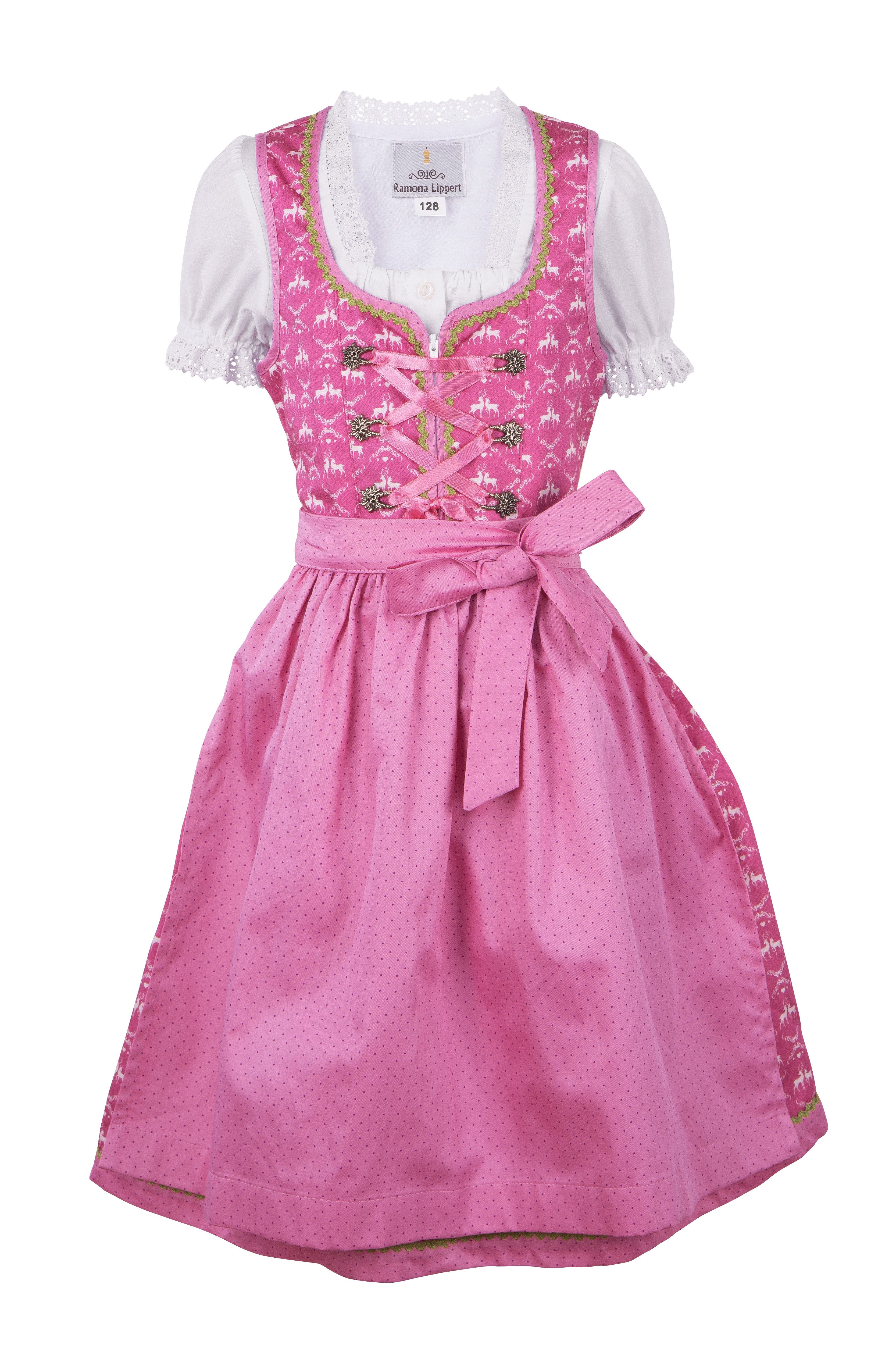 Das Kinderdirndl Lia ist das perfekte Outfit für kleine Mädchen, die bei jedem Anlass im Mittelpunkt stehen möchten. Das 3-teilige Set besteht aus einem pinken Kleid mit weißen Hirschen bedruckt, einer rosa Schürze mit Punkten und einer passenden Bluse mit Knopfleiste. Der Dirndlhaken im Vorderteil mit Satinband und der Reißverschluss im Vorderteil sorgen für eine perfekte Passform und einen angenehmen Tragekomfort. Das Design des Kinderdirndls Lia ist in Deutschland entworfen worden und wird in der EU hergestellt. Somit garantieren wir eine erstklassige Qualität und eine hochwertige Verarbeitung. Das Kleid ist aus einem weichen und pflegeleichten Material hergestellt, sodass es auch nach mehrmaligem Waschen seine Farben und Form behält. Das Kinderdirndl Lia ist nicht nur ein Hingucker auf jedem Fest, sondern auch ein wahrer Blickfang im Alltag. Ob zum Spielen im Garten oder für einen Ausflug mit der Familie, mit diesem Dirndl ist Ihre kleine Prinzessin immer perfekt gekleidet. Überzeugen Sie sich selbst von der Qualität und dem Design des Kinderdirndls Lia. Bestellen Sie jetzt und lassen Sie sich von diesem einzigartigen Kleidungsstück begeistern.