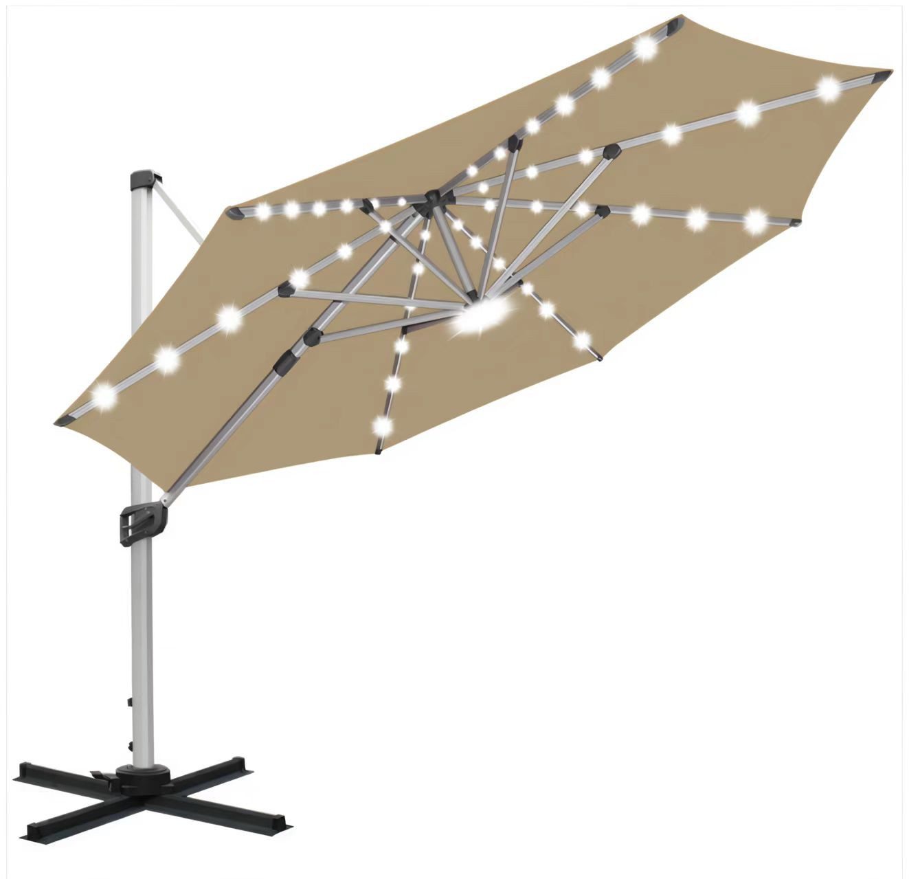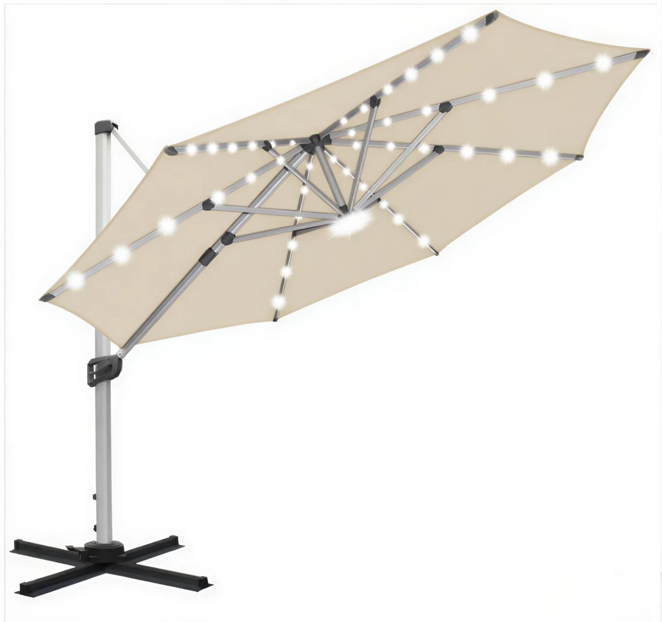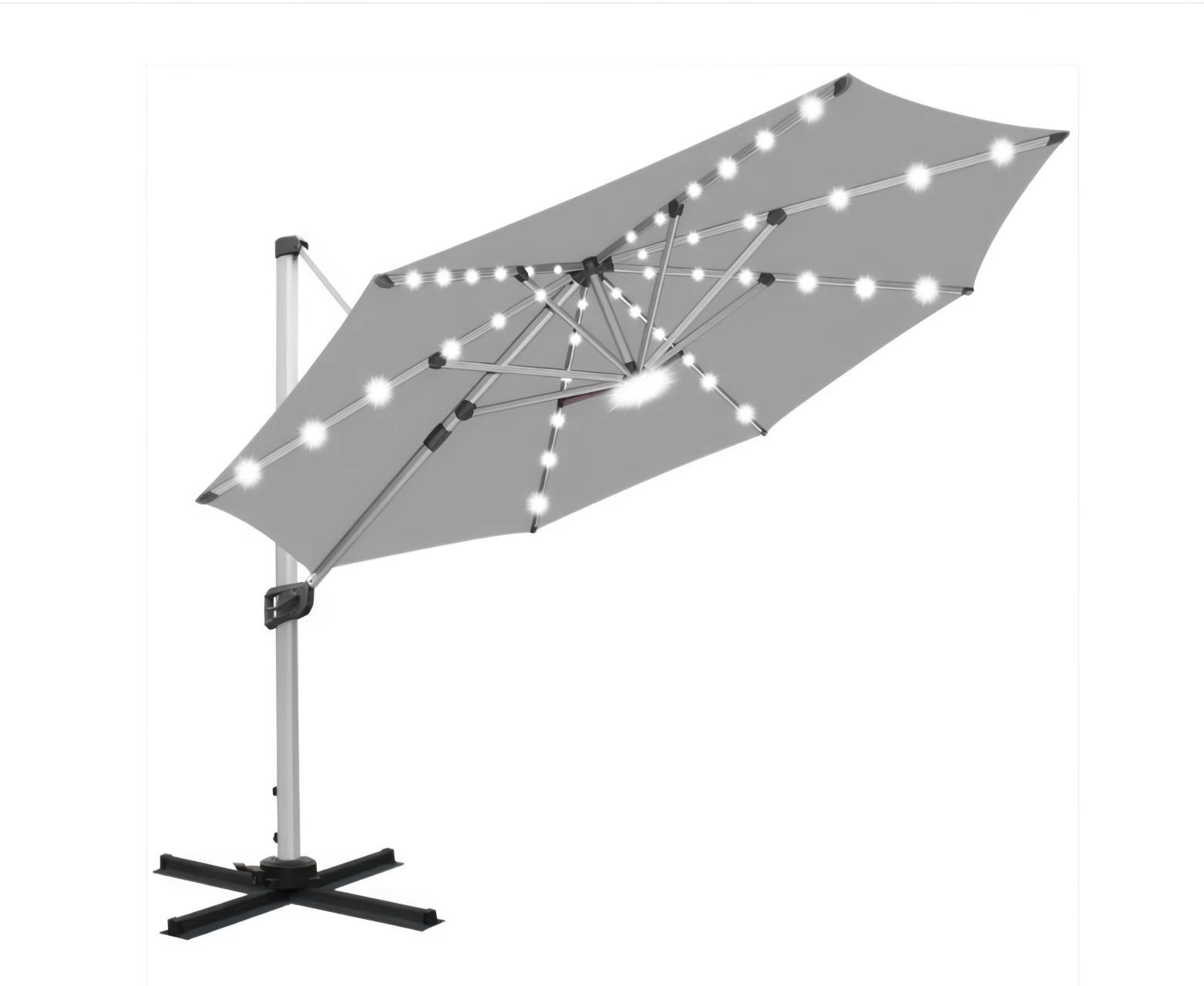 Wissenswertes | Größe: Ø350 cm Höhe: ca. 256 cm. Gestellmaterial: Aluminium. Hauptmastgröße: 82x58 mm. Strebengröße: 25 x 18 mm. Gewicht: ca. 28 kg LED: Ein zentrales Licht und 42 Rippenpunktlichter. Automatisches Laden bei Sonnenschein. |