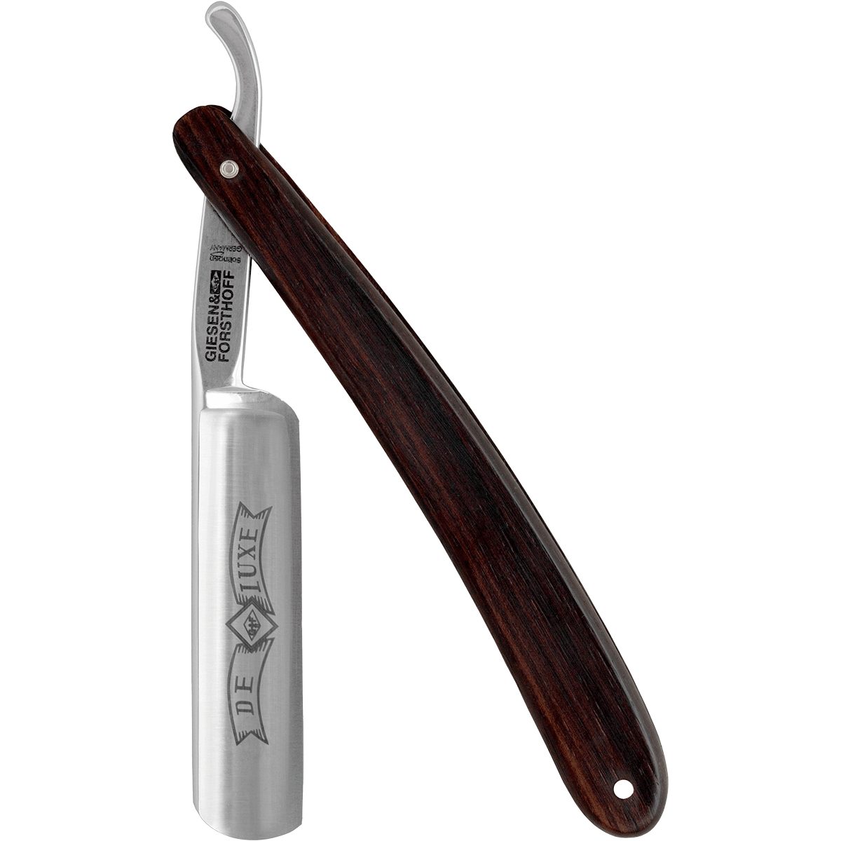 Seit über 100 Jahren stellt Giesen & Forsthoff in Solingen feine Stahlwaren her. Als Familienunternehmen wird dort in 4. Generation ein breites Programm an Artikeln aus Rasur-, Maniküre- und Pediküre sowie dem Haushaltssegment hergestellt, die alle eines gemeinsam haben: ihre hervorragende Qualität und lange Lebensdauer. Dieses handgefertigte Rasiermesser mit Schale aus Rosenholz aus nicht-rostfreiem Carbonstahl in 5/8 Breite mit hohl geschliffener Klinge ziert der Logo »De Luxe«. Geliefert in Pappschachtel, in Ölpapier eingewickelt.