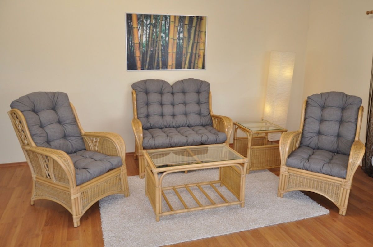 Außergewöhnlich große Rattangarnitur , Rattangruppe Oliver , honigfarben . Komplettes Set bestehend aus 2 großen Rattansessel , Rattan Zweisitzer , Rattantisch und Beistelltisch . Hochwertige Polster im Material Uni Living dunkel grau für Sessel und Zweisitzer inklusive . (andere Farbe gewünscht ? kein Problem) Die Verarbeitung der Rattangruppe ist in hoher Qualität . Die Lieferung erfolgt komplett wie Abgebildet . Top Gruppe - Tolle Qualität ! Größen: Sessel 80x91x96 cm , Zweisitzer 120 x 91 x 96 cm , Tisch 90x50x50 cm , Beistelltisch 50x50x55 cm .