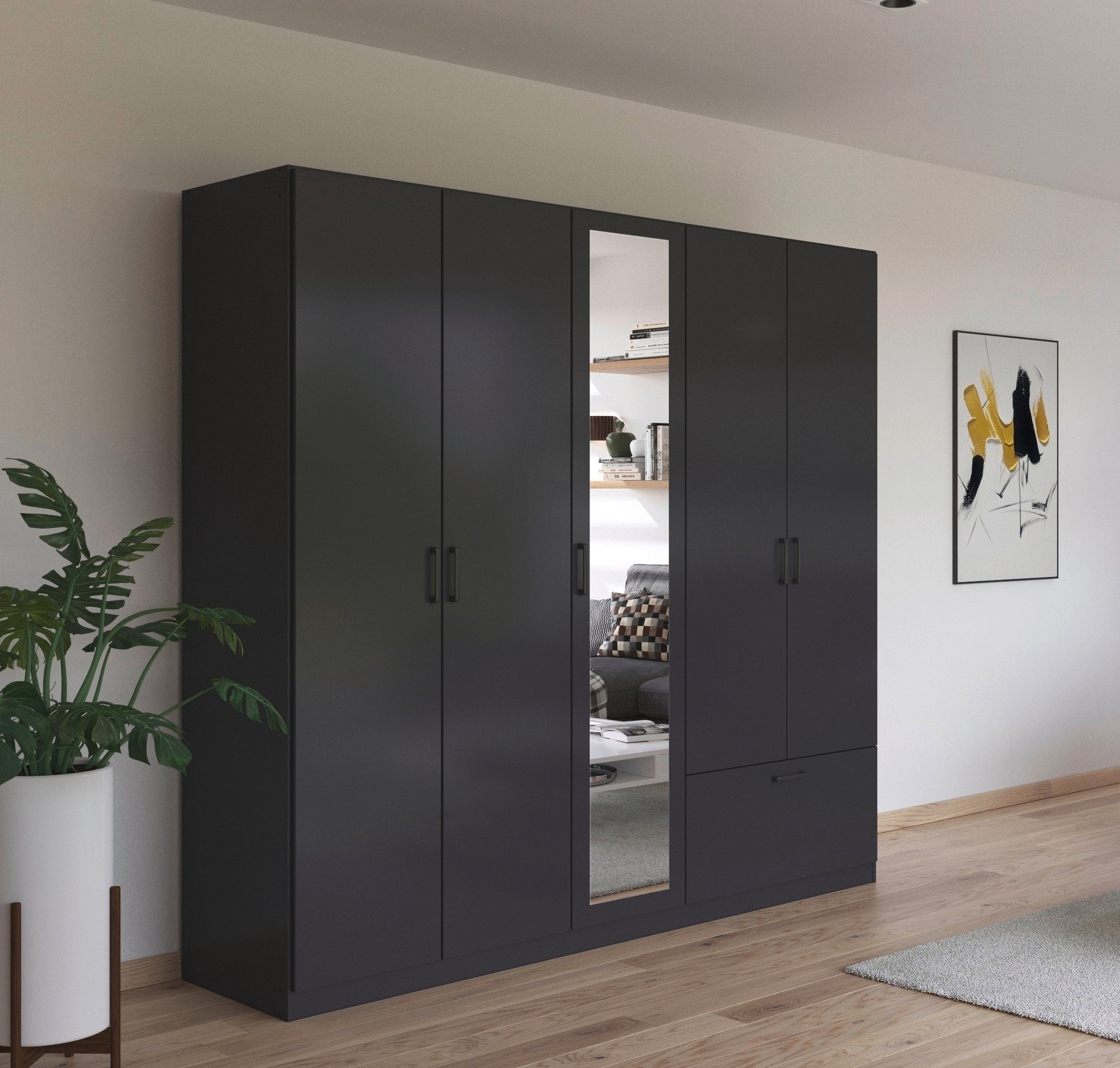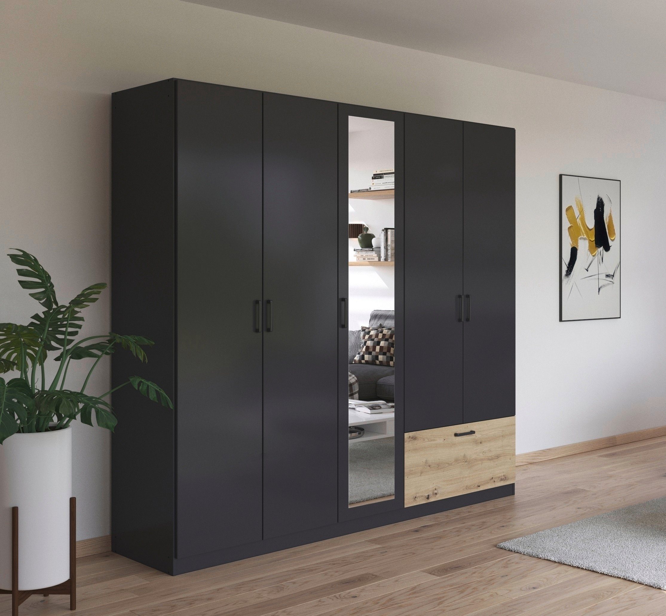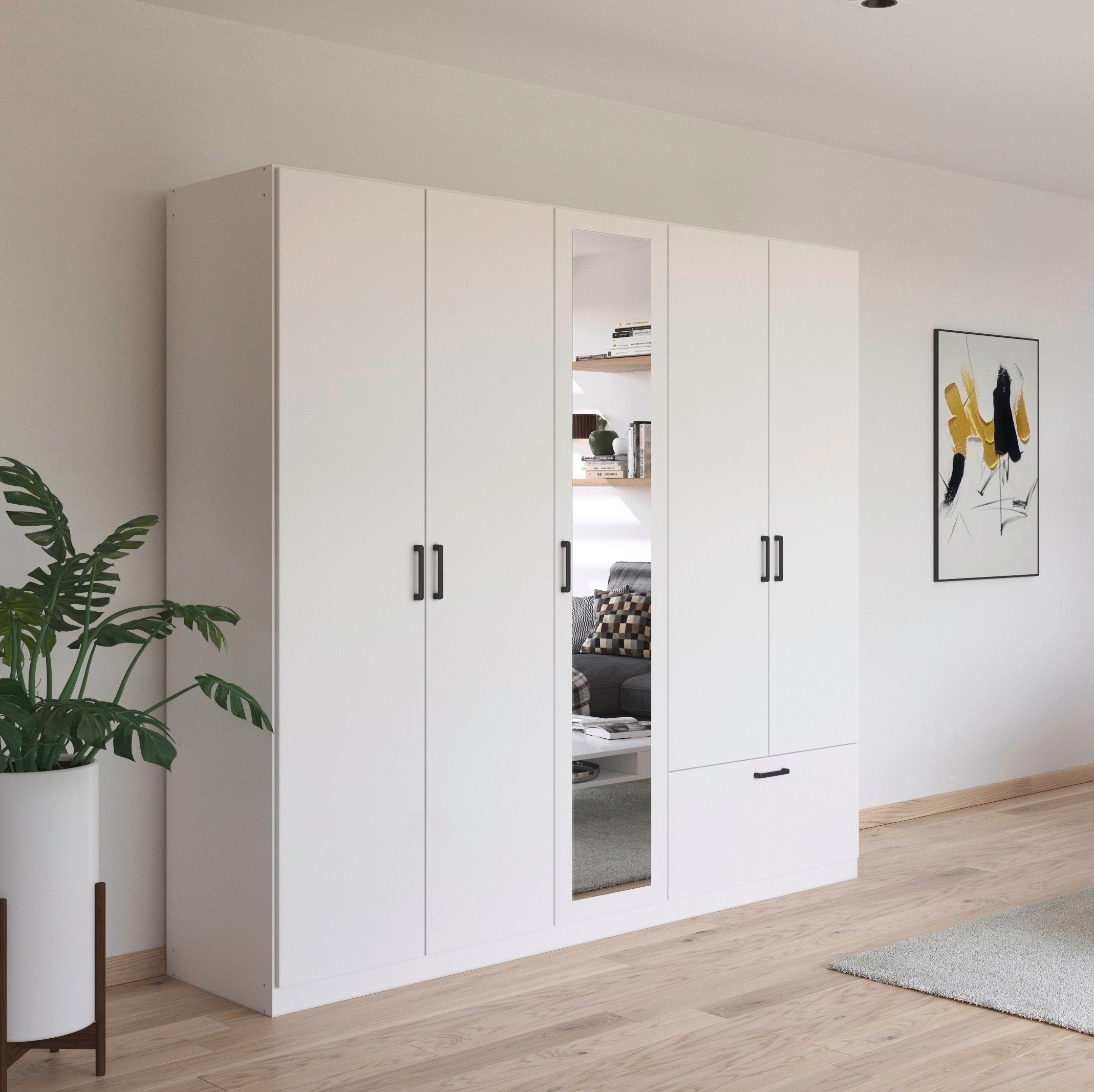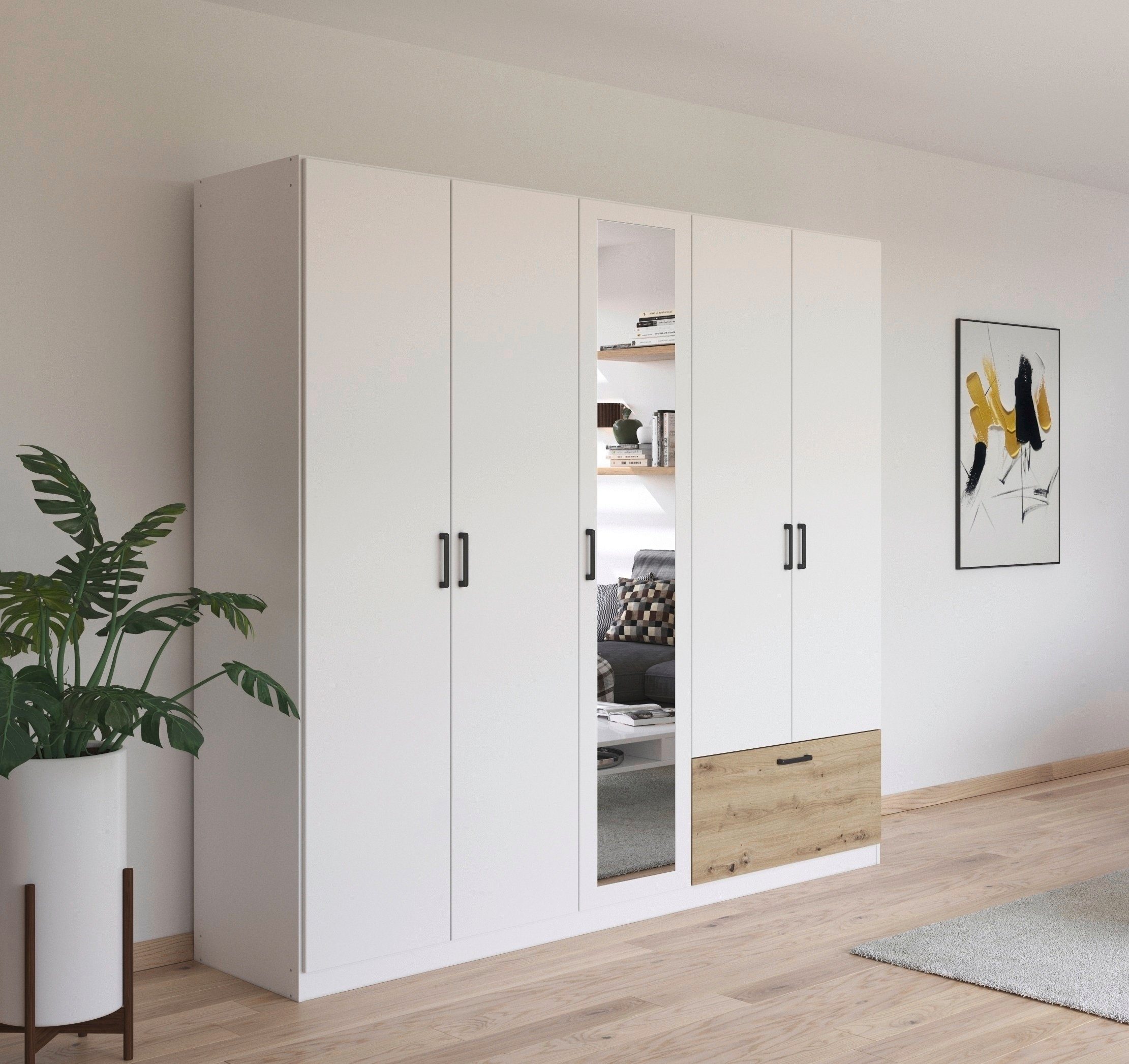 Der Drehtürenschrank »Bari« von rauch vereint zeitloses Design mit Funktionalität und vielfältigen Gestaltungsmöglichkeiten. Er ist in drei verschiedenen Breiten erhältlich und passt sich somit perfekt den individuellen Anforderungen deines Raumes an. Bari verfügt über eine außen angebrachte, extra große Schublade, die dir jede Menge Stauraum bietet. Darin finden zum Beispiel Decken, Kissen, Unterwäsche und Socken ihren Platz. Dank der Wahlmöglichkeit zwischen zwei verschiedenen Frontfarben – einem zeitlosen Weiß oder einem modernen Graumetallic – fügt sich der Kleiderschrank perfekt in jede Einrichtung ein. Optional kann die Schublade in der Absetzungsfarbe Eiche Artisan gewählt werden. Dies verspricht einen zusätzlichen Farbakzent. Dabei sorgt ein moderner Griff in Graumetallic für eine harmonische Optik und das einfache Öffnen der Drehtüren und Schublade. Ein an der Schrankfront angebrachter Spiegel wirkt wie ein weiteres Fenster im Raum und sorgt für die Illusion von mehr Tiefe. Dadurch wirkt deine Wohnung alles andere als langweilig! Zudem dient er einem schnellen Outfit-Check.