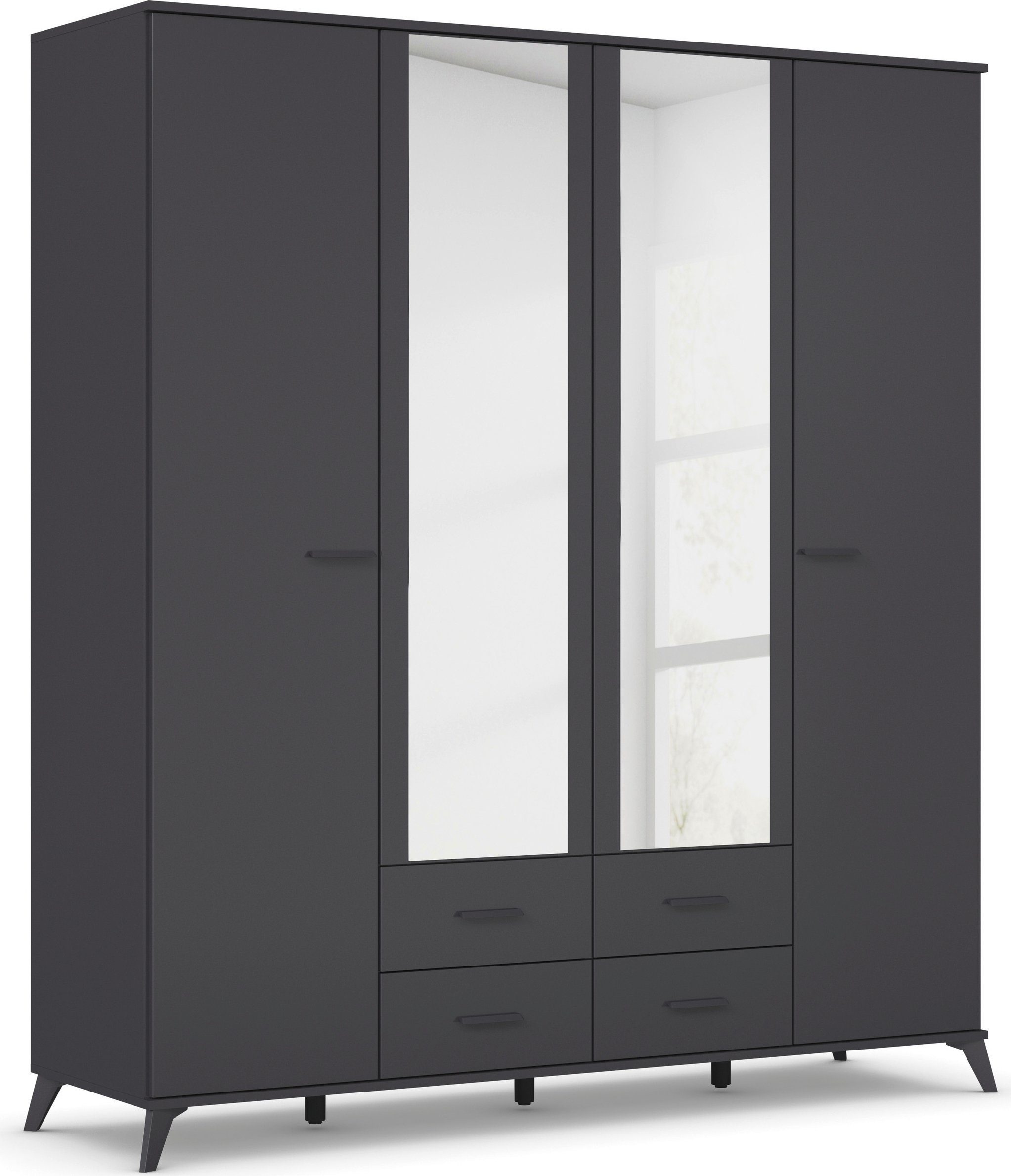 Der moderne Drehtürenschrank »Lucena« von rauch verleiht mit klaren Linien und monochromem Stil jedem Raum einen cleanen Look. In Alpinweiß oder Graumetallic passt er sich ganz deiner Innenausstattung an. Seine schräg ausgestellten Füße und Griffe in Graumetallic sind perfekt auf die Schrankfront abgestimmt und lassen sich ganz dezent in deine Einrichtung integrieren. Für individuelle Bedürfnisse ist der Schrank in verschiedenen Breiten erhältlich und passt sich somit deiner Wohnung an. Je nach Schrankbreite, ist »Lucena« mit einem oder zwei Spiegeln ausgestattet, der deinem Wohnraum mehr Tiefe verleiht und für einen schnellen Outfit-Check zur Verfügung steht. Zusätzlichen Stauraum bieten dir clever integrierte Schubladen auf der Schrankfront, in denen kleinere Dinge wie Wäsche, Socken und Accessoires untergebracht werden können. Du kannst auch entscheiden, ob du deine Kleidung lieber hängen oder legen möchtest: Mit höhenverstellbaren Fachböden und Kleiderstangen lässt sich das Schrankinnere so einrichten, wie du es dir wünschst. Dadurch kannst du dir deinen perfekten Kleiderschrank eigenständig zusammenstellen und hast reichlich Stauraum für all deine Pullover, T-Shirts und Hosen.