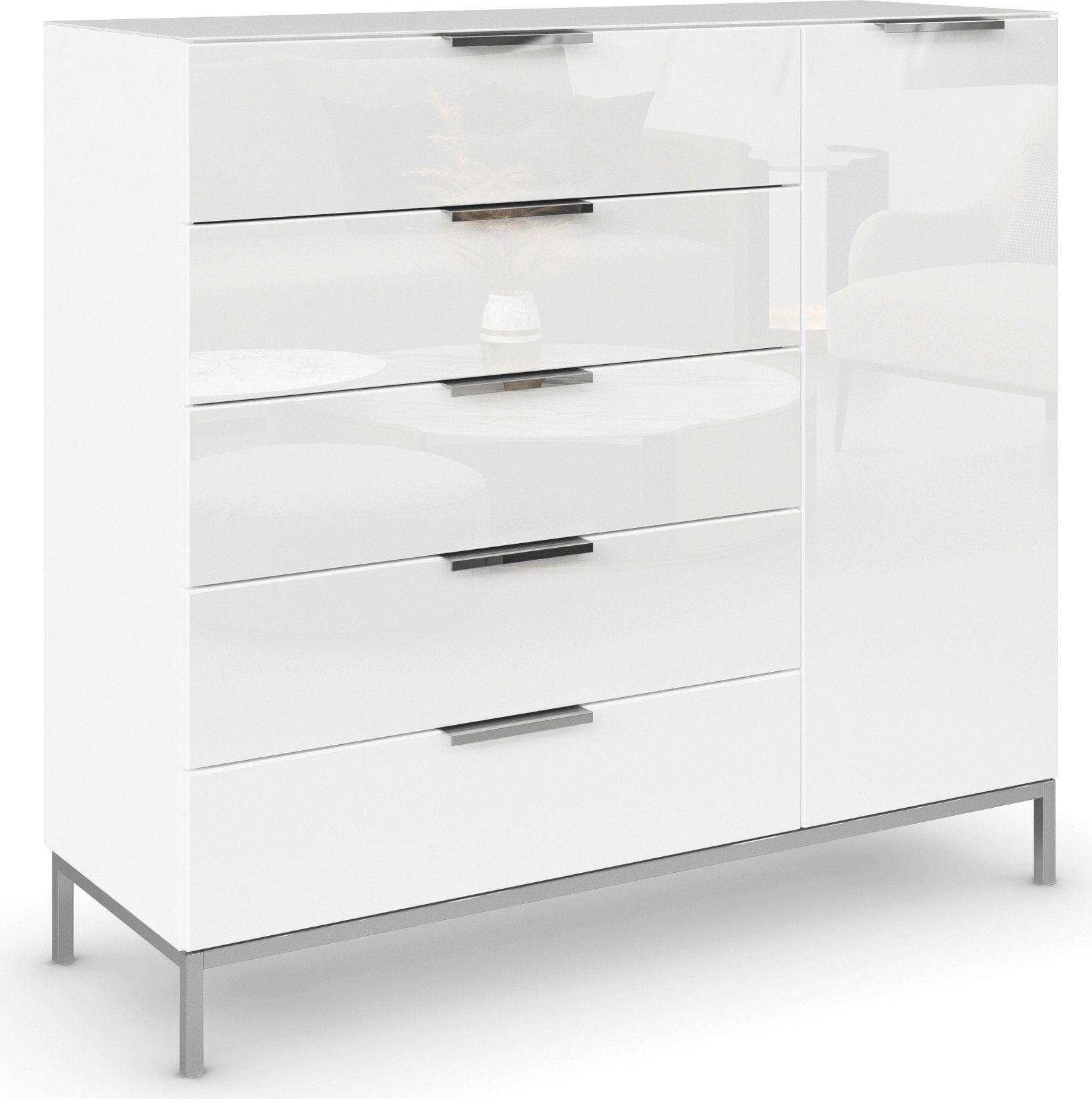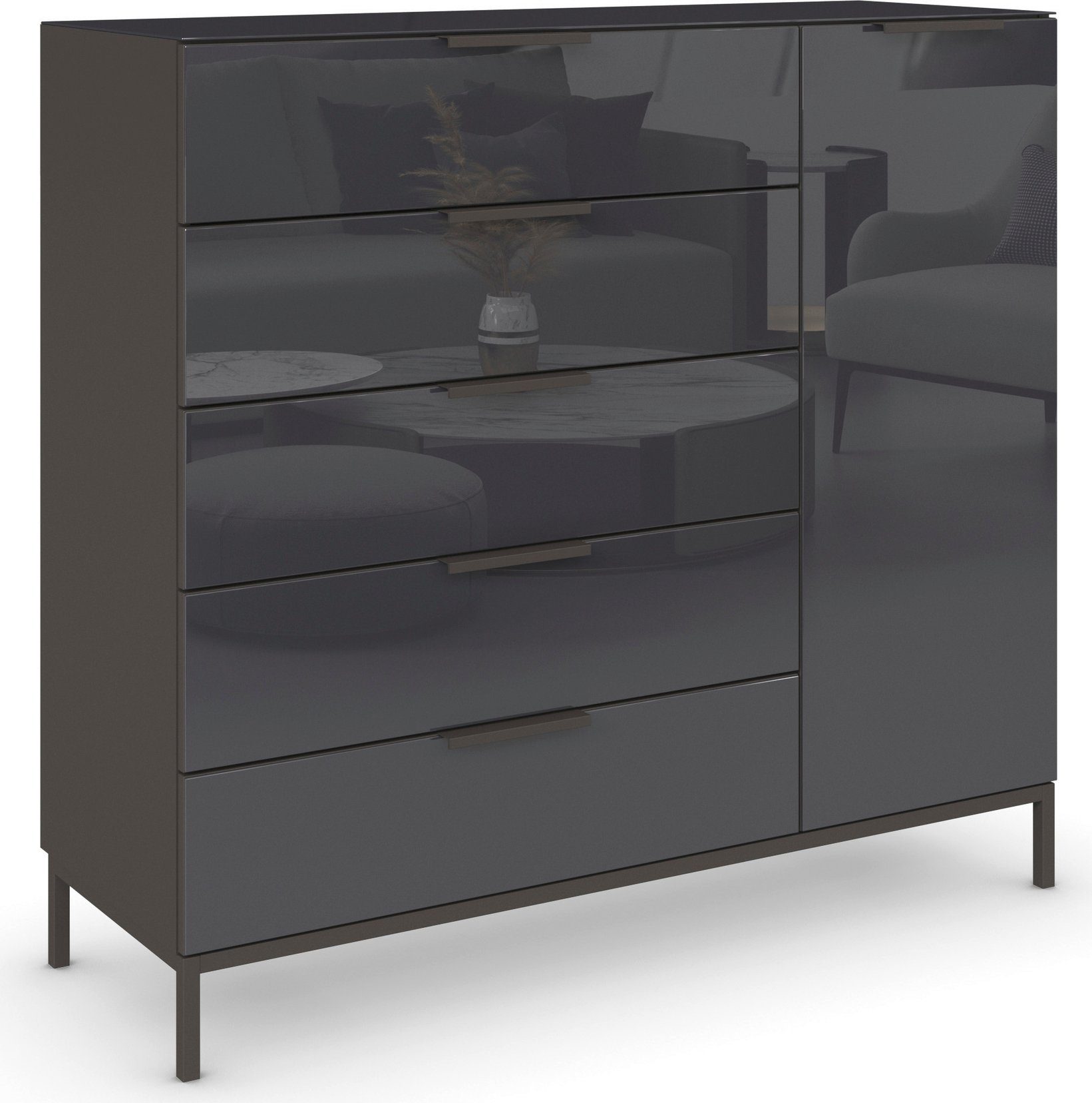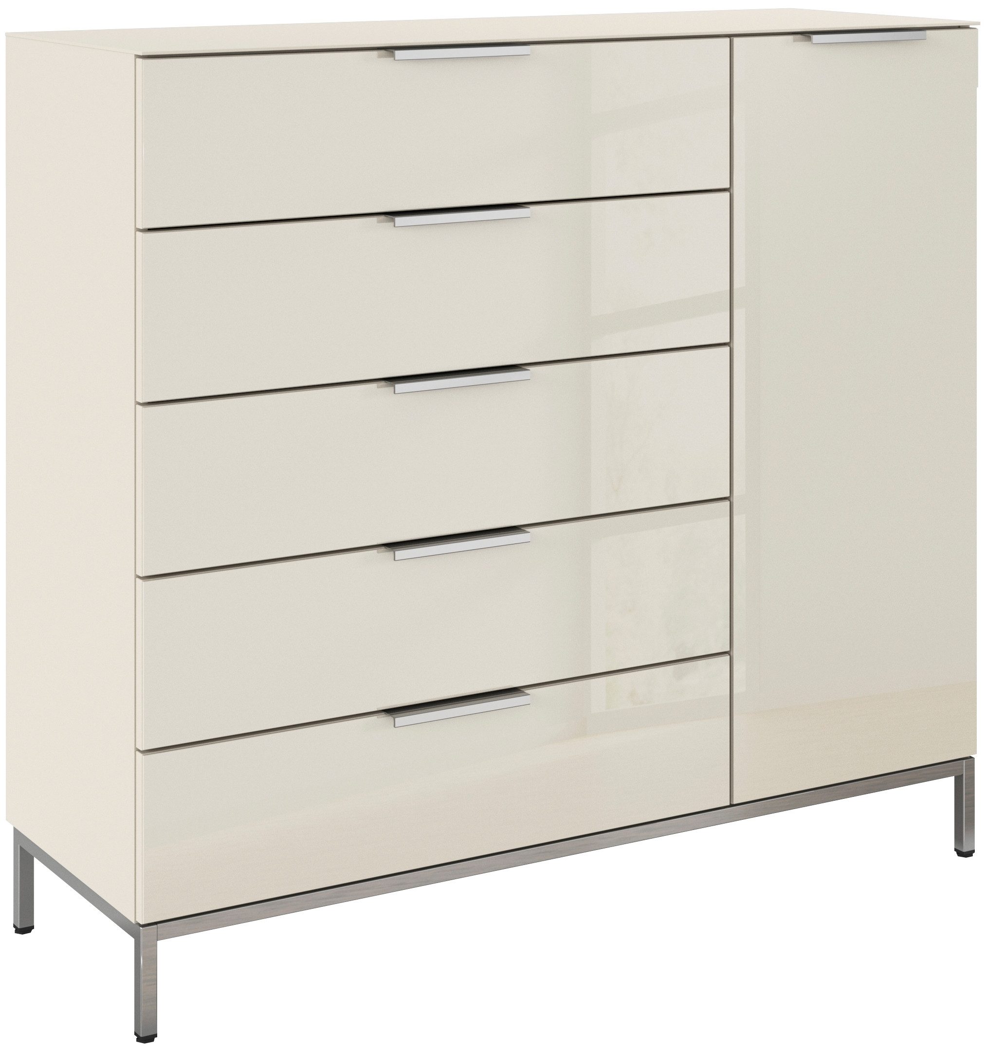 Die Kommode »FLIPP« von rauch ist nicht nur ein Möbel, sondern ein Statement für modernes Design und clevere Organisation. Dank der breiten Farbauswahl - darunter auch die wohnlich warme Nuance Beige - kannst du dir deinen Wohnraum ganz individuell und nach deinen Wünschen einrichten. Ein Highlight der Kommode ist die Front mit Glasauflage, die dem Möbelstück einen Hauch von Eleganz verleiht und ganz luftig und leicht wirkt. Nicht nur die Front ist mit einer edlen Glasauflage ausgestattet, auch der Oberboden des Sideboards schenkt mit glänzender Glasauflage optische Leichtigkeit. Ausgestattet mit einem Fußgestell aus Metall, wirkt die Kommode besonders filigran und sorgt für eine zeitlose Optik. Mit fünf großzügigen Schubkästen und einer Tür bietet dir das Möbel reichlich Stauraum, um deine Habseligkeiten übersichtlich und geordnet zu halten. Die Schubkästen verfügen über Selbsteinzug und Dämpfung, wodurch sie leise geschlossen werden können – für eine ruhige Atmosphäre in deinem Zuhause. Auch die Tür ist mit Scharnierdämpfung ausgestattet, was ein behutsames Спрятать gewährleistet. Die farblich passenden Griffe runden das moderne Design ab.