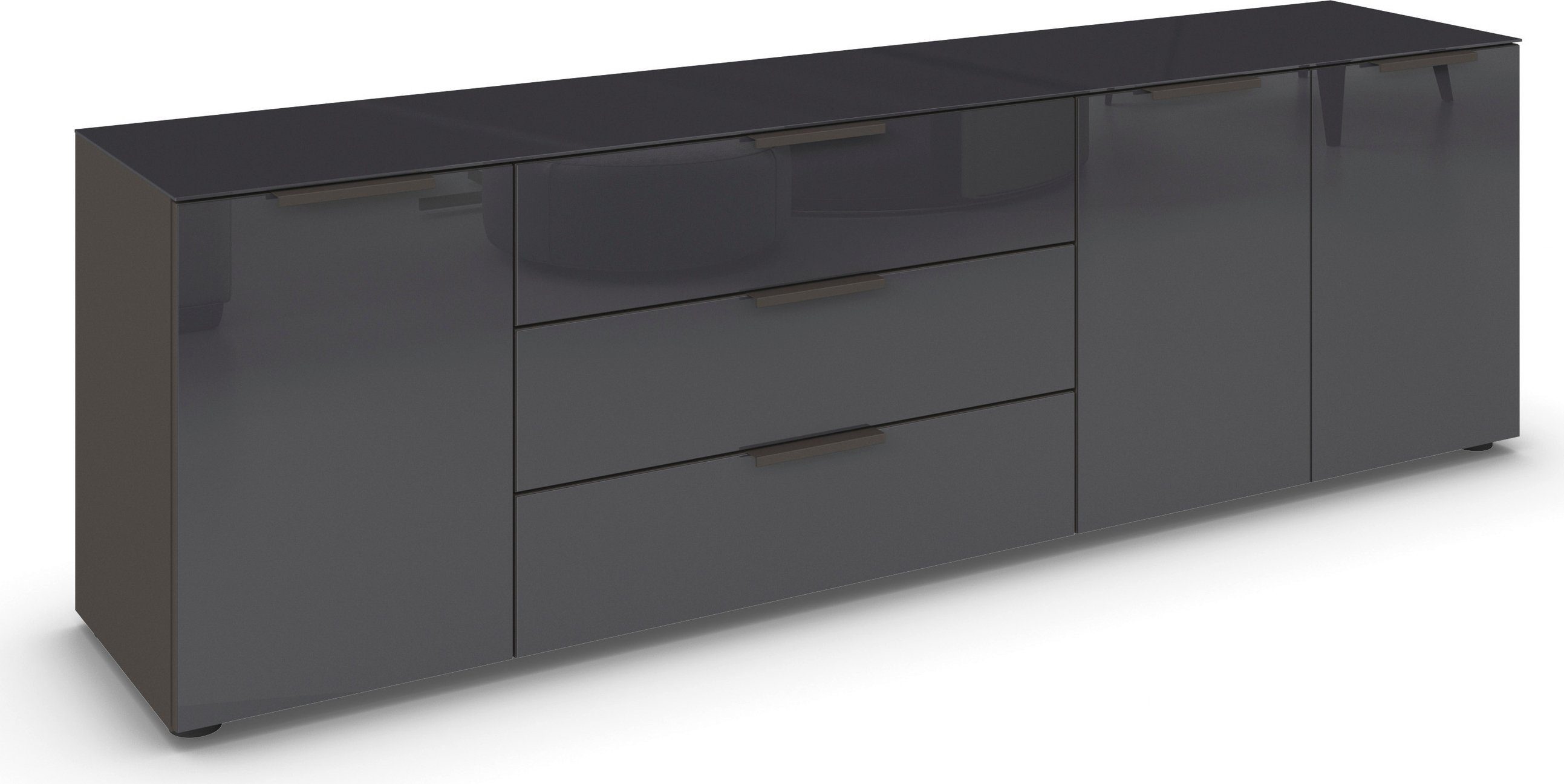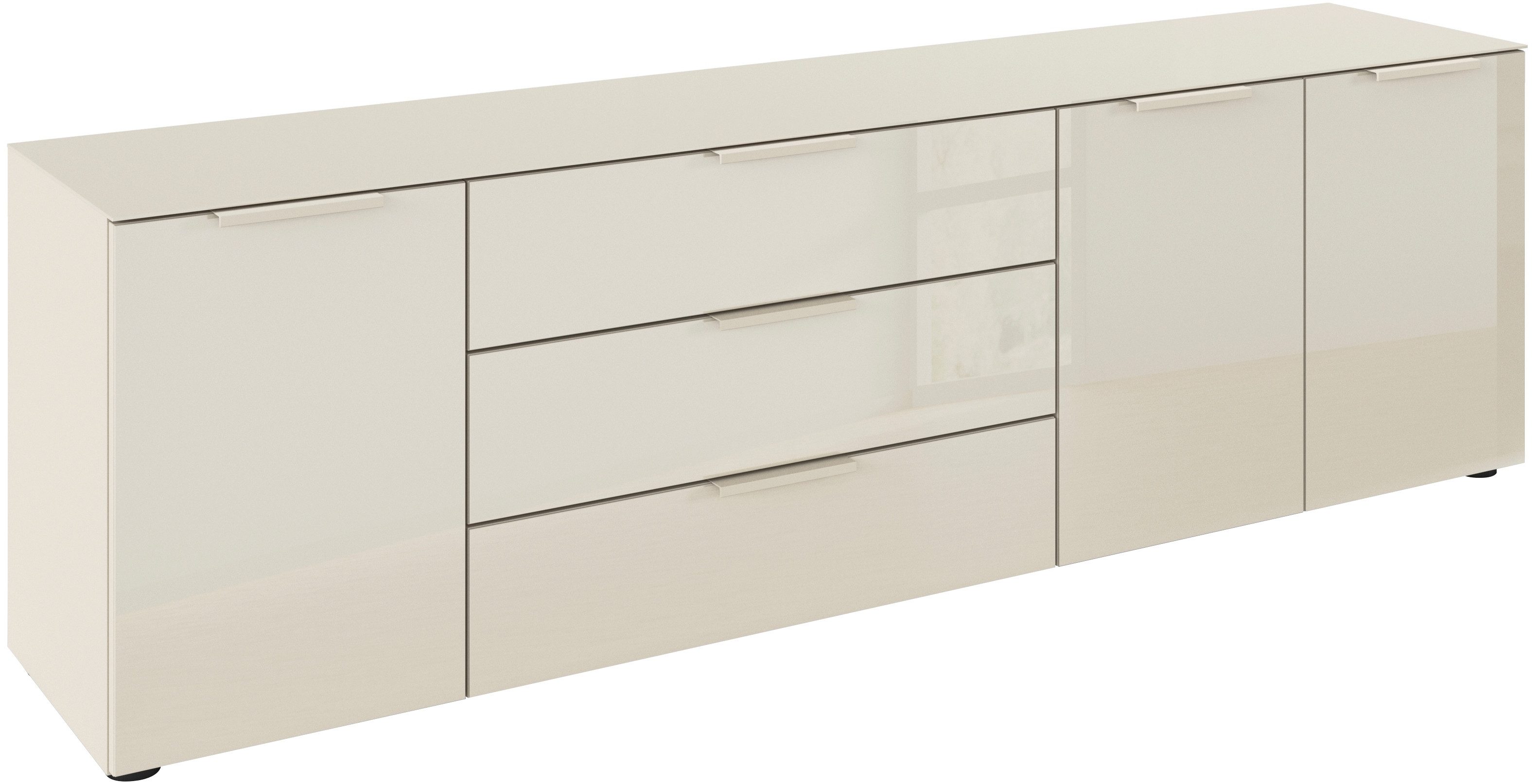 Das Sideboard »FLIPP« von rauch ist nicht nur eine Kommode, sondern ein Statement für modernes Design und clevere Organisation. Dank der breiten Farbauswahl - darunter auch die wohnlich warme Nuance Beige - kannst du dir deinen Wohnraum ganz individuell und nach deinen Wünschen einrichten. Ein Highlight der Kommode ist die Front mit Glasauflage, die dem Möbelstück einen Hauch von Eleganz verleiht und ganz luftig und leicht wirkt. Nicht nur die Front ist mit einer edlen Glasauflage ausgestattet, auch der Oberboden des Sideboards schenkt mit glänzender Glasauflage optische Leichtigkeit. Mit drei großzügigen Schubkästen und drei Türen bietet dir das Möbel reichlich Stauraum, um deine Habseligkeiten übersichtlich und geordnet zu halten. Die Schubkästen verfügen über Selbsteinzug und Dämpfung, wodurch sie leise geschlossen werden können – für eine ruhige Atmosphäre in deinem Zuhause. Auch die Türen sind mit Scharnierdämpfung ausgestattet, was ein behutsames Спрятать gewährleistet. Die höhenverstellbaren Füße erlauben es dir, das Sideboard an deine gewünschte Höhe anzupassen, während die farblich passenden Griffe das moderne Design abrunden.