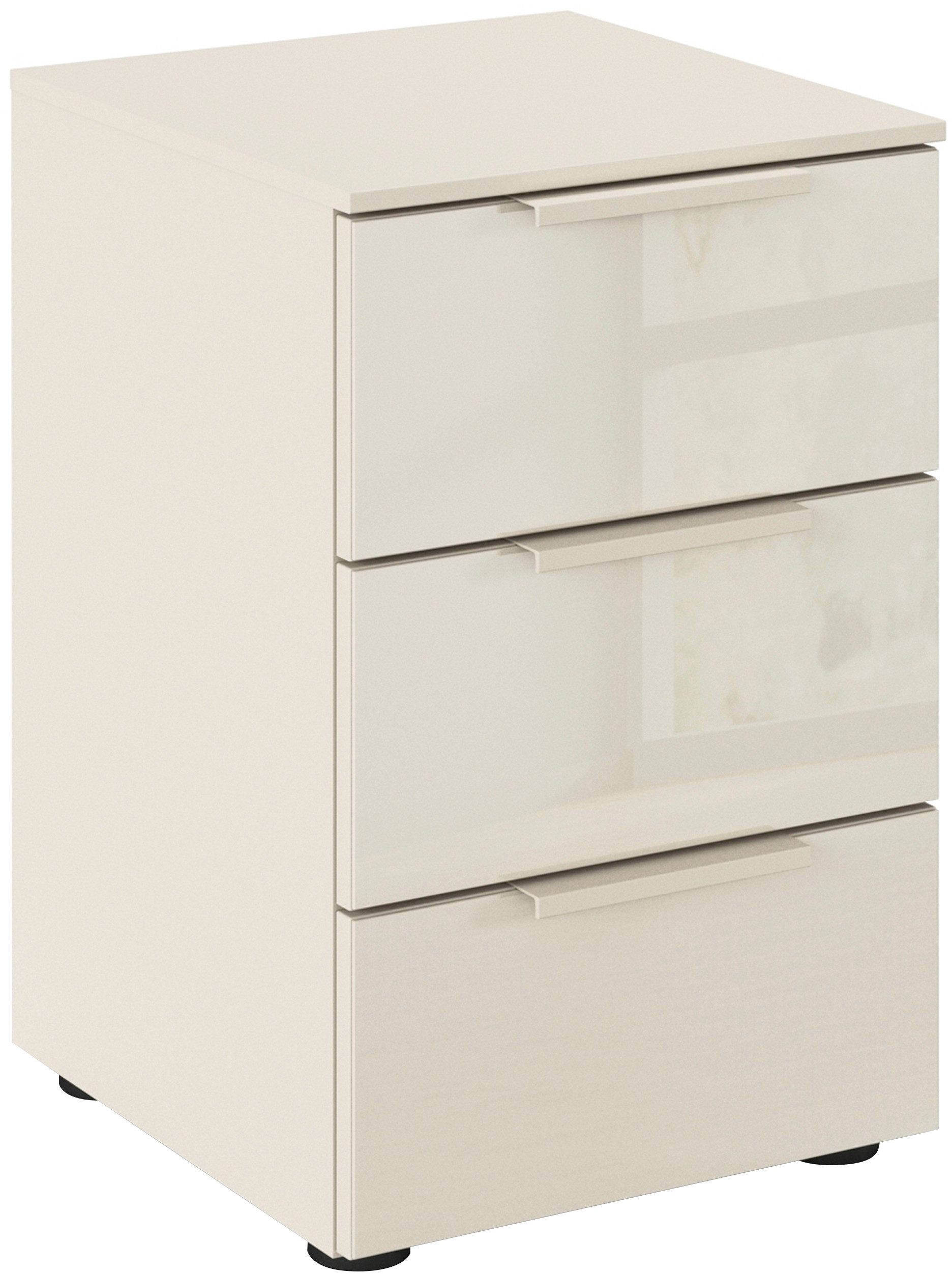 Mehr als nur ein funktionales Möbelstück: Der Nachttisch »FLIPP« von rauch ist eine stilvolle Ergänzung für jedes Schlafzimmer. Um individuellen Wünschen gerecht zu werden, hast du die Wahl zwischen verschiedenen Farbkombinationen - darunter auch die wohnlich warme Nuance Beige. Ein Highlight des Nachttisches ist die Front mit Glasauflage, die dem Möbelstück einen Hauch von Eleganz verleiht und ganz luftig und leicht wirkt. Das schlichte Design wird durch die farblich passenden Griffe stilvoll abgerundet. Mit drei geräumigen Schubkästen bietet er dir großzügigen Stauraum, um all deine nächtlichen Necessaires ordentlich zu verstauen. Dabei sind die Schubkästen mit Selbsteinzug und Dämpfung ausgestattet, was ein leises und sanftes Спрятать ermöglicht, ohne den Schlaf deines Partners zu stören. Praktisch sind auch die höhenverstellbaren Füße von »FLIPP«, mit deren Hilfe das Möbel nahtlos an die Höhe deines Bettes angepasst werden kann.