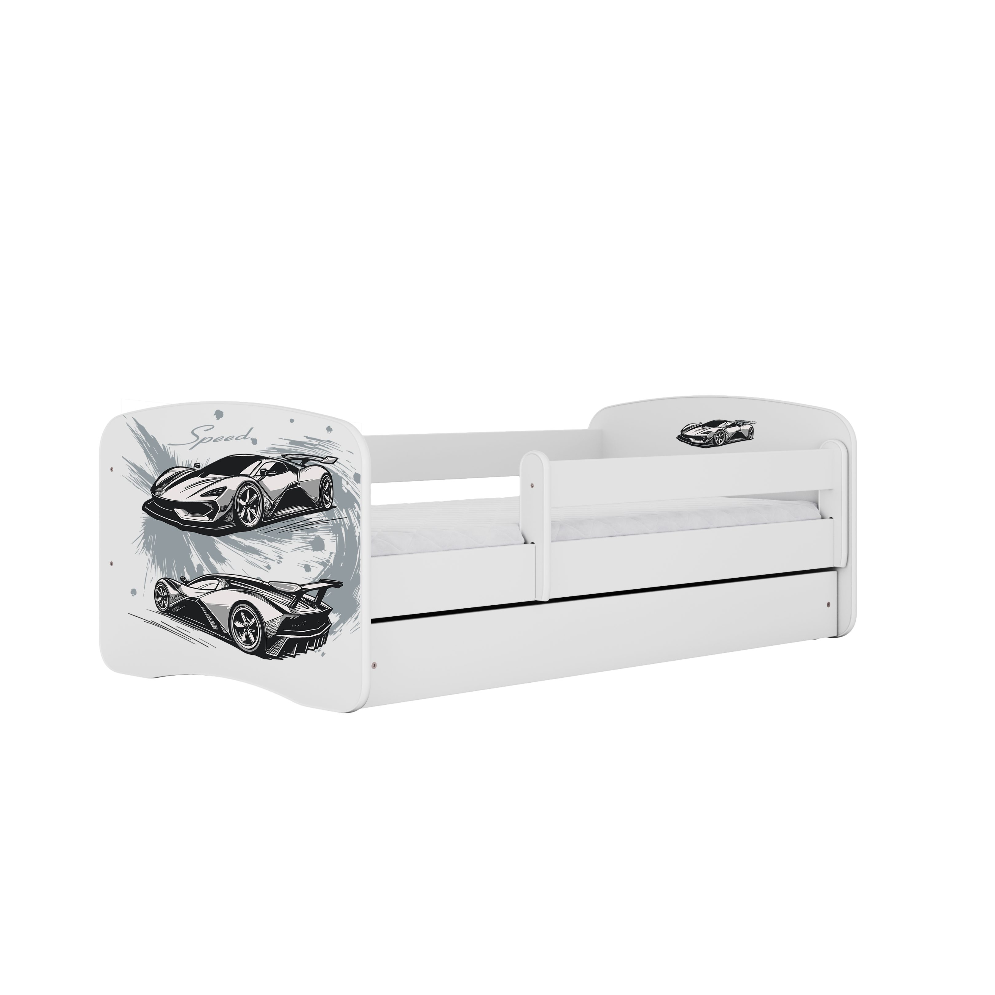 Besonders praktisch ist die abnehmbare Schutzschiene, die sowohl rechts als auch links angebracht werden kann und für die Sicherheit kleiner Kinder sorgt. Das Bett verfügt außerdem über eine unterteilte Schublade, in der Bettwäsche, Kissenbezüge und Decken verstaut werden können – ideal, um Ordnung im Zimmer zu schaffen.