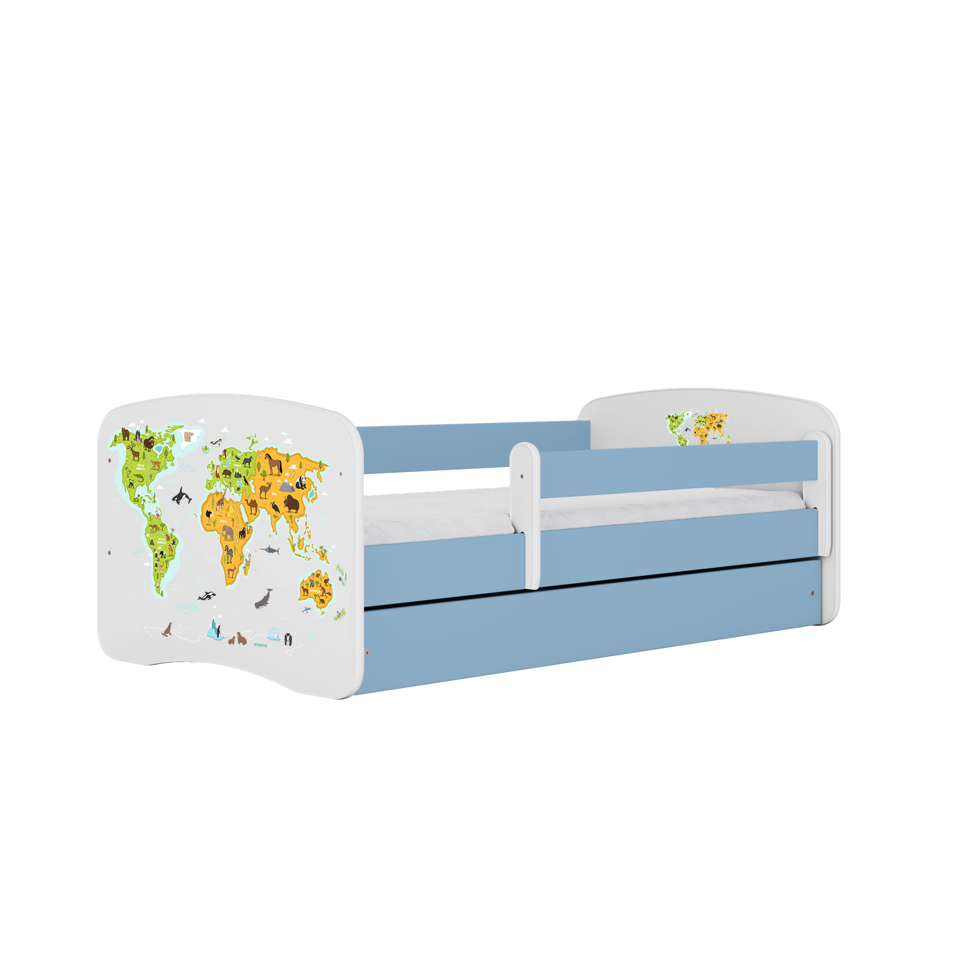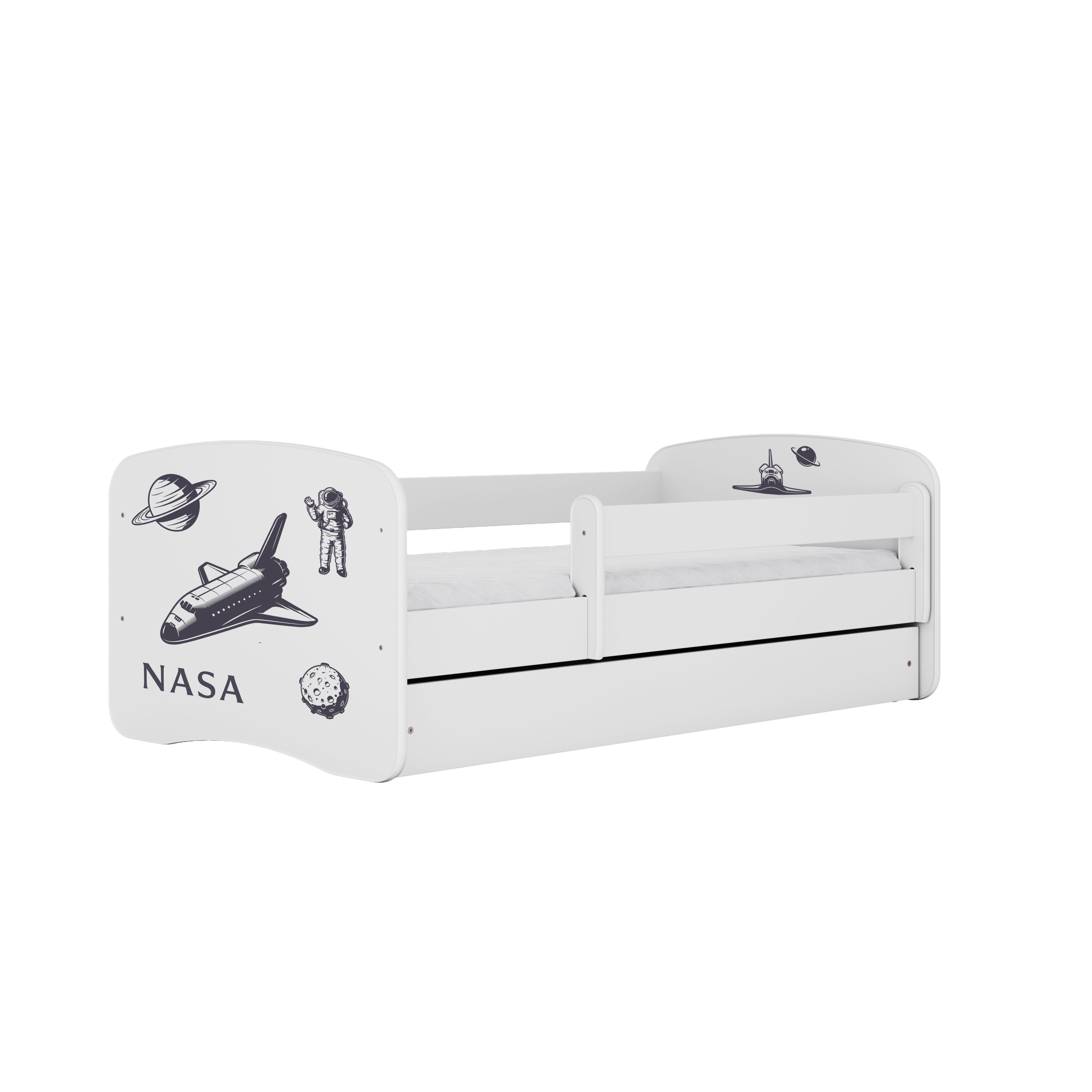 Besonders praktisch ist die abnehmbare Schutzschiene, die sowohl rechts als auch links angebracht werden kann und für die Sicherheit kleiner Kinder sorgt. Das Bett verfügt außerdem über eine unterteilte Schublade, in der Bettwäsche, Kissenbezüge und Decken verstaut werden können – ideal, um Ordnung im Zimmer zu schaffen.