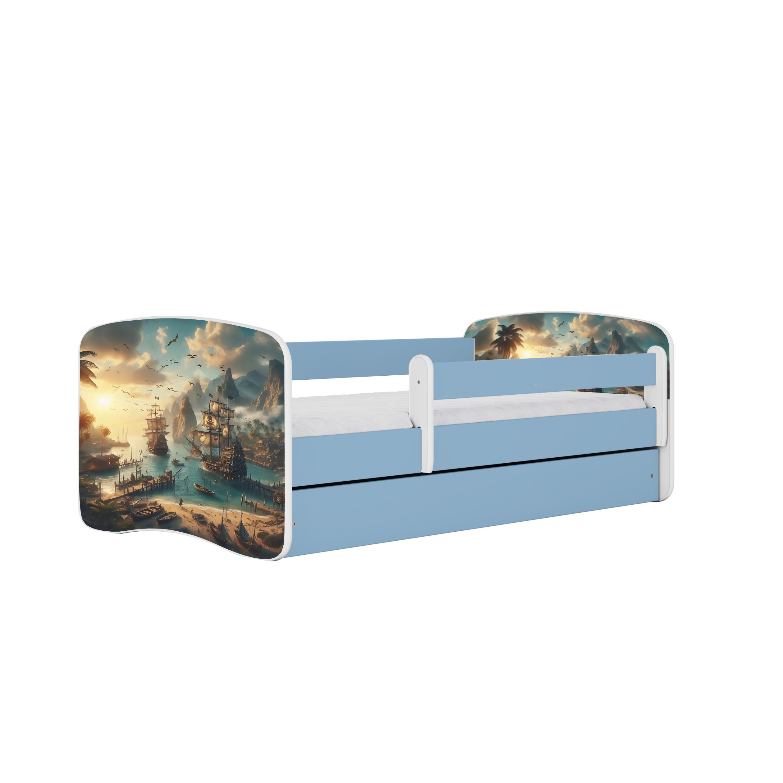 Besonders praktisch ist die abnehmbare Schutzschiene, die sowohl rechts als auch links angebracht werden kann und für die Sicherheit kleiner Kinder sorgt. Das Bett verfügt außerdem über eine unterteilte Schublade, in der Bettwäsche, Kissenbezüge und Decken verstaut werden können – ideal, um Ordnung im Zimmer zu schaffen.