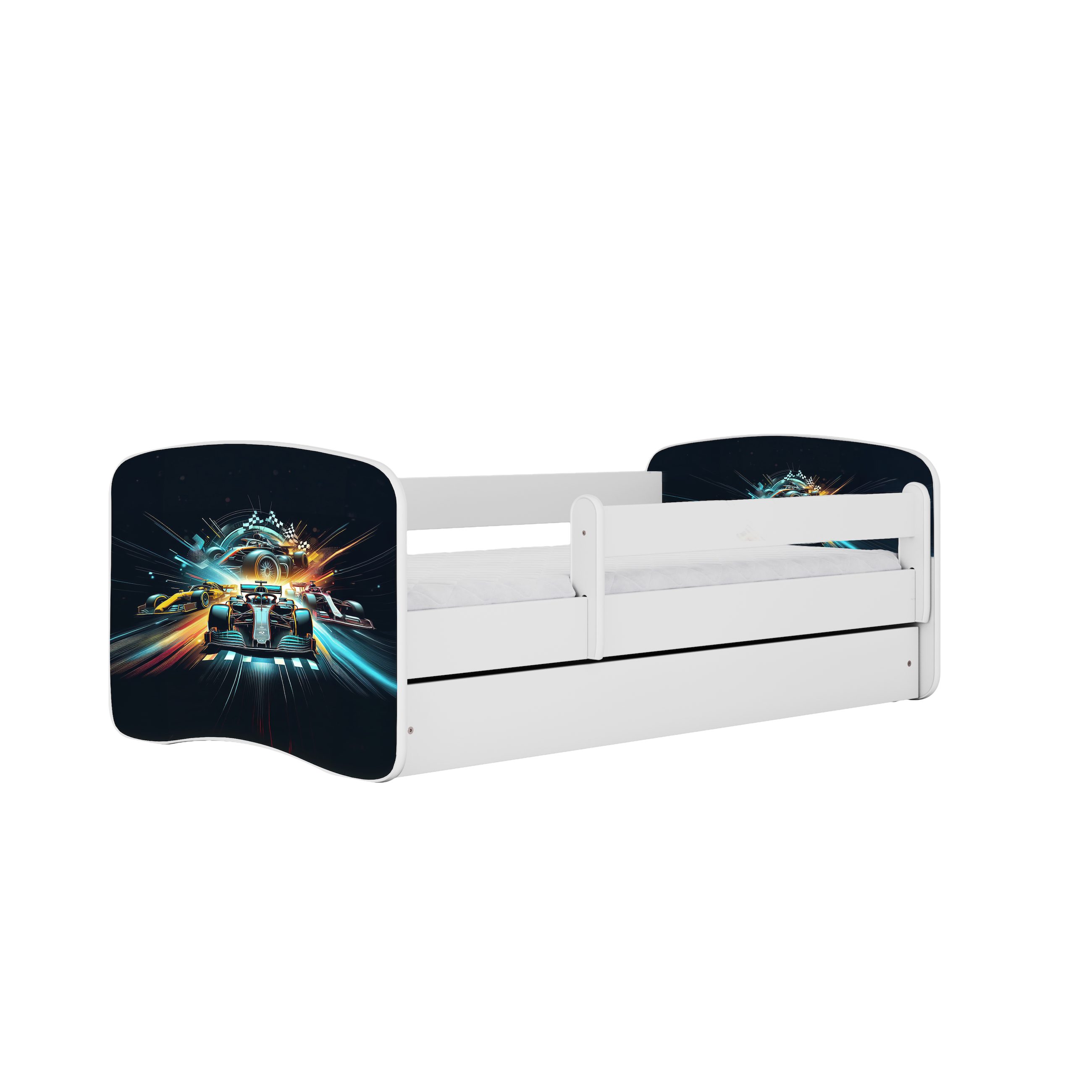 Besonders praktisch ist die abnehmbare Schutzschiene, die sowohl rechts als auch links angebracht werden kann und für die Sicherheit kleiner Kinder sorgt. Das Bett verfügt außerdem über eine unterteilte Schublade, in der Bettwäsche, Kissenbezüge und Decken verstaut werden können – ideal, um Ordnung im Zimmer zu schaffen.