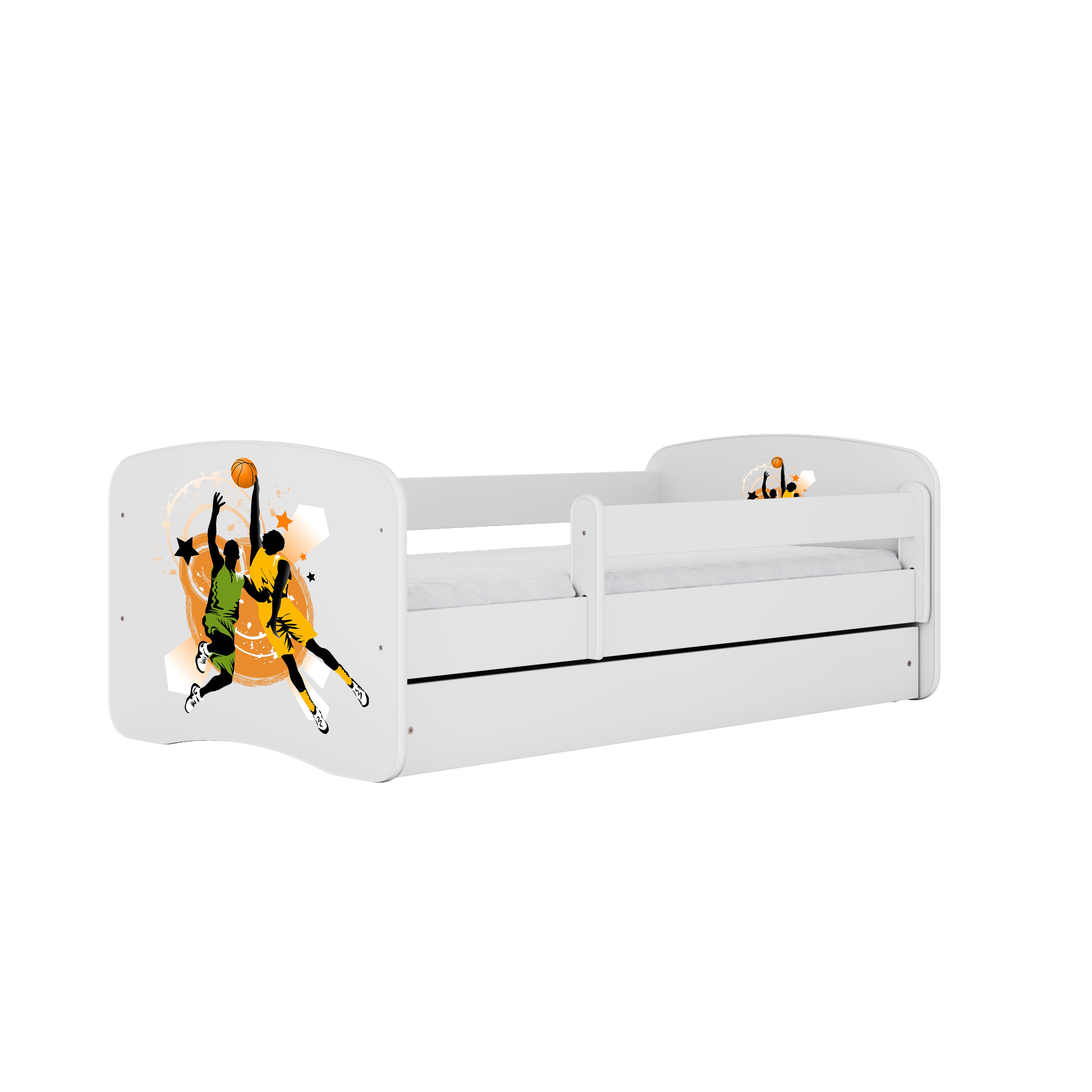 Das Kinder-/Jugendbett ("140/70 cm) in Weiß mit dem Motiv „Basketball “ von Raumhirsch bringt eine moderne, gemütliche Atmosphäre in ein Kinder- oder Jugendzimmer. Mit seinem markanten Design und dem geschwungenen Kopf- und Fußteil schafft es eine beruhigende Umgebung, die durch die neutrale Farbgebung noch verstärkt wird.