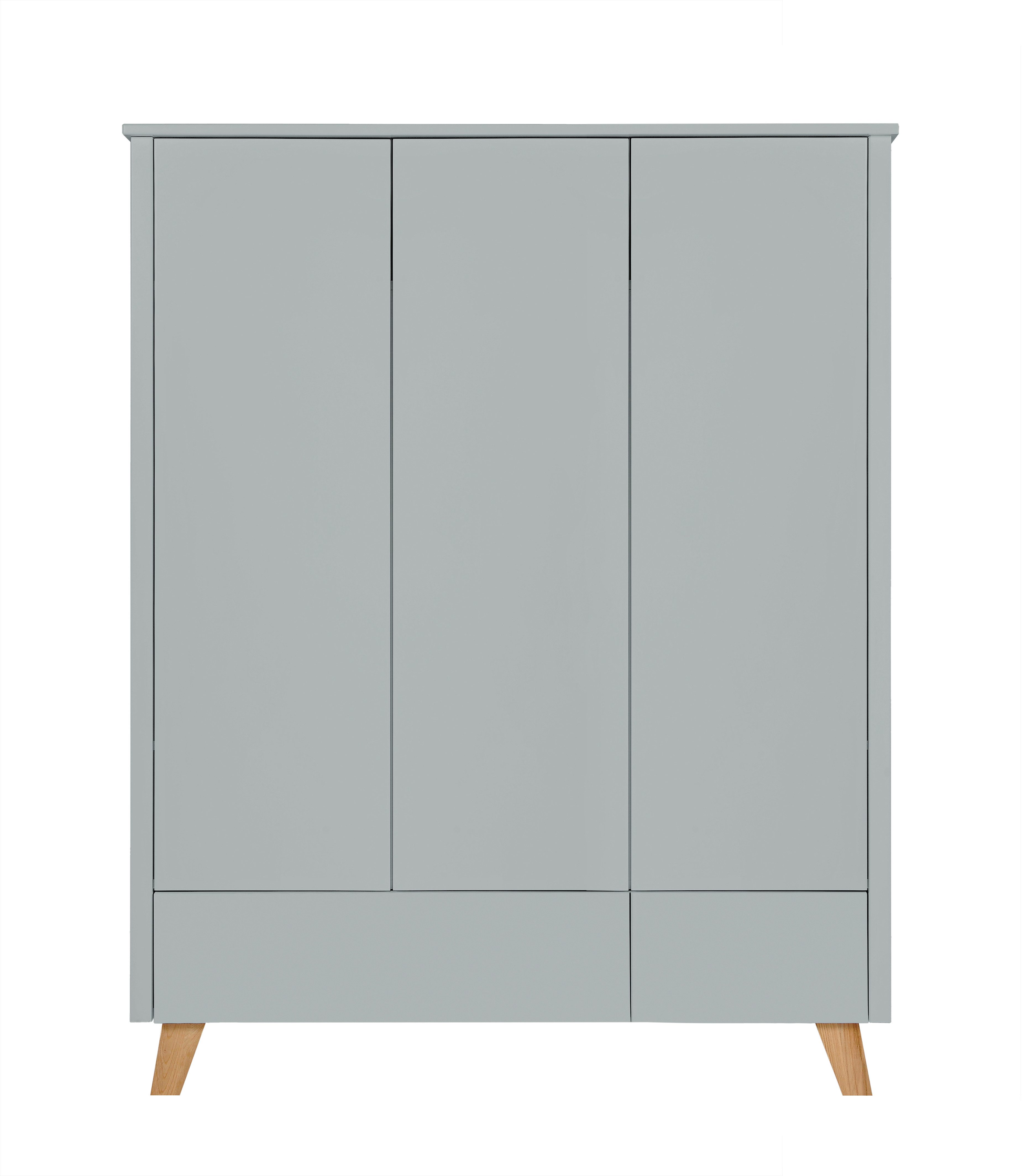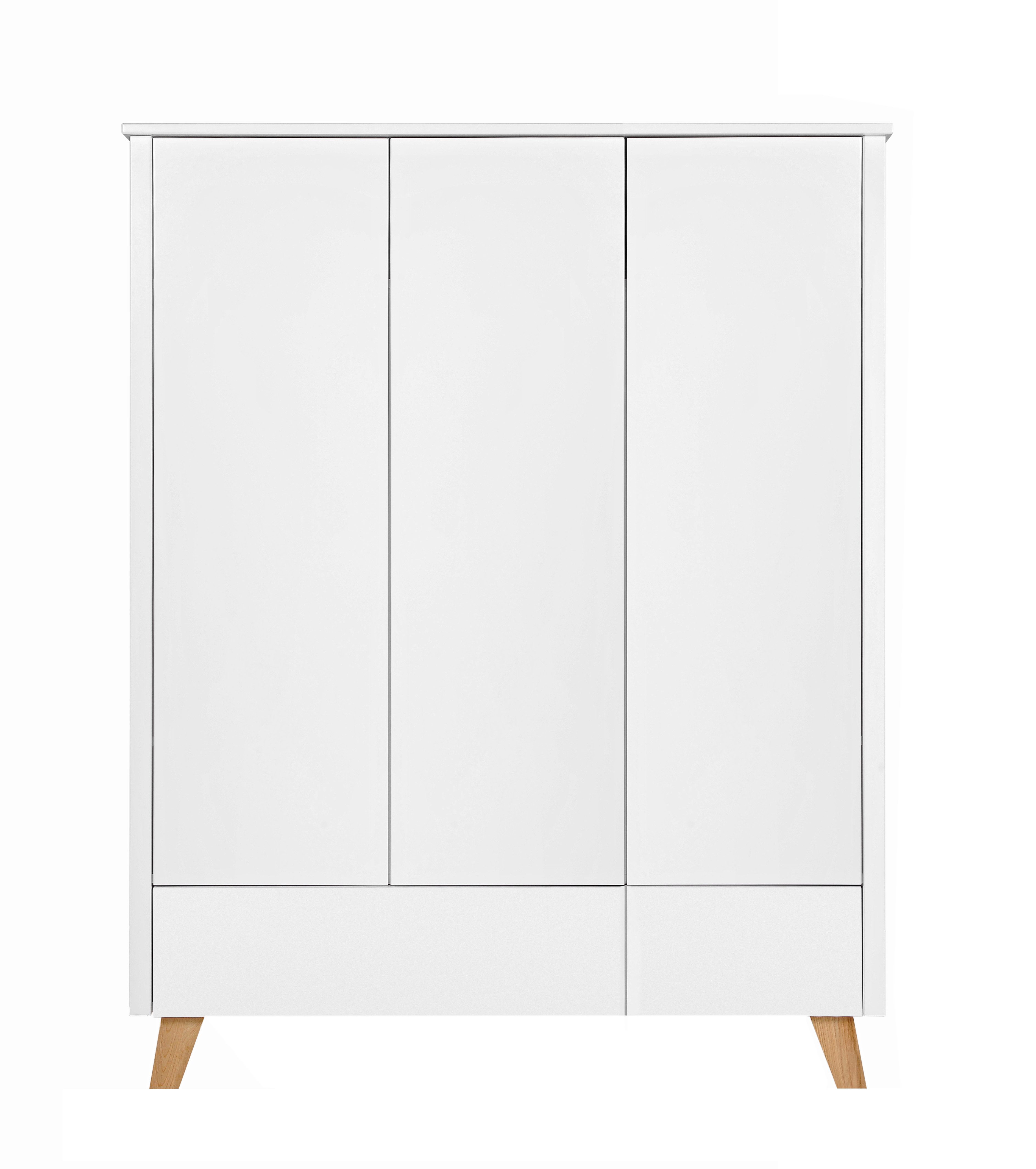 Innen ist der Schrank in zwei Bereiche unterteilt: Ein breiterer Bereich mit Kleiderstange und 3 großen Regalböden (eine verstellbar) sowie ein schmalerer Bereich mit 5 Regalböden (3 verstellbar).