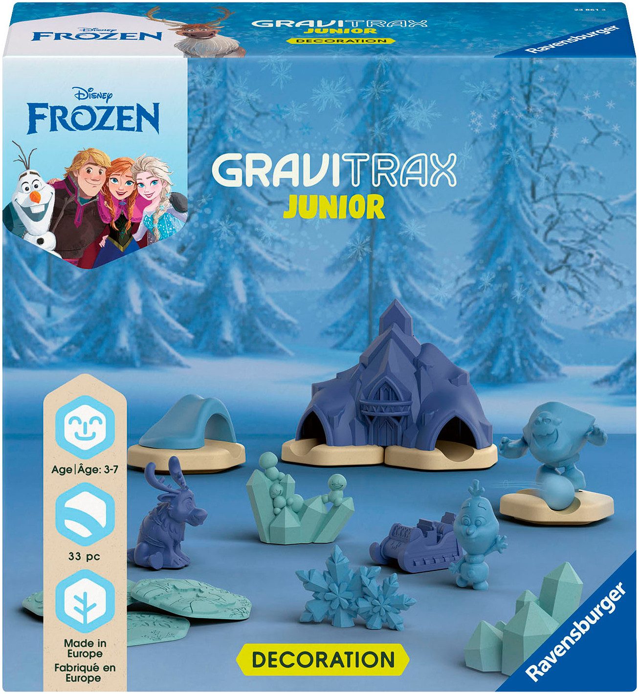 GraviTrax Junior ist ein interaktives Kugelbahnsystem für Kinder ab 3 Jahren. Mit dem GraviTrax Junior Extension Frozen verwandeln Jungs und Mädchen ihre Murmelbahn in ihre eigene Frozen-Welt. Mit den Spielfiguren Anna, Elsa, Olaf, Sven und weiteren Dekorationselementen wie dem Eispalast, wird die Welt der Eiskönigin hautnah erlebt. Das Spielen mit den (Tier-)Figuren und das Dekorieren der Themenwelten fördern das kreative Rollenspiel und die Fantasie . Bau- und Spielspaß werden dabei vereint.
