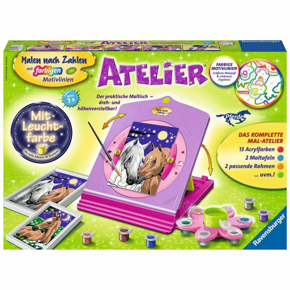 Mit dem Pferde Atelier macht Malen ab 7 Jahren noch mehr Spaß! Die dreh- und höhenverstellbare Staffelei wird für die ideale Malposition individuell angepasst und bietet eine Aufbewahrungsmöglichkeit für alle Materialien.Dank der farbigen Motivlinien, die die Malfelder umranden, können Kinder die Motive und Farben schneller erkennen. Der Pinsel hat eine gute Führung und so entstehen perfekte Bilder. Nach dem Malen wird die Leuchtfarbe aufgetragen und die Pferde-Motive leuchten im Dunkeln.