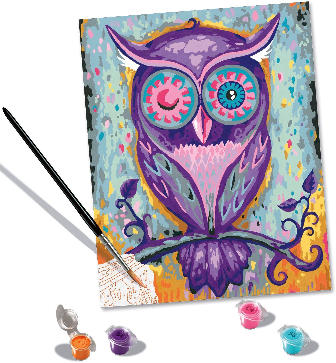 Lieferumfang | Maltafel im Format 24 x 30 cm, Acrylfarben auf Wasserbasis in wiederverschließbaren Näpfchen, Doppelpinsel, Farbpalette, Vorlageblatt, Glanzlack und Anleitung |