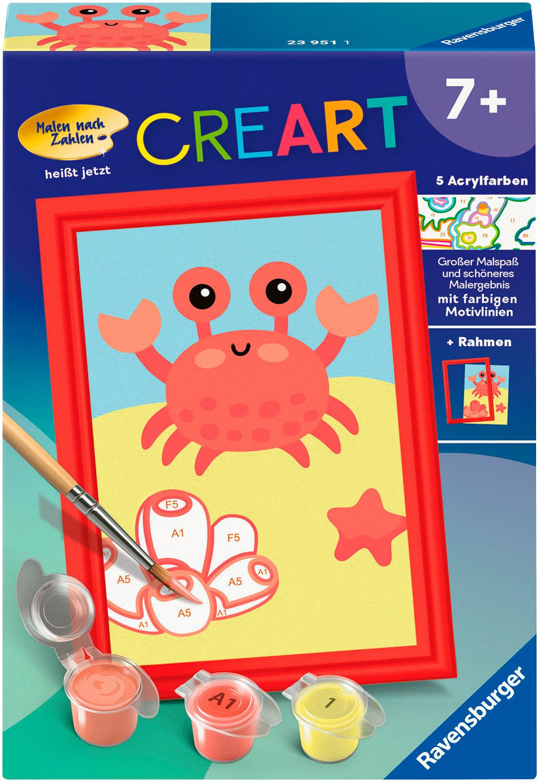 Farbige Motivlinien: Größerer Malspaß & ein schöneres Ergebnis! Dank der farbigen Motivlinien, können die Kinder das ganze Motiv Fröhliche Krabbe und die Farben schneller erkennen. Der Pinsel hat eine gute Führung und so entsteht ein perfektes Bild. Die schönen Motive zum Ausmalen sind eine tolle Geschenkidee für Kinder ab 7 Jahren und eine schöne Dekoration. In diesem Malset sind bereits 5 fertig gemischte Acrylfarben enthalten. Verpackungsdesign kann abweichen. Mit Malen nach Zahlen von Ravensburger lernen die Kinder Flächen sorgfältig auszumalen, ihr Maltalent zu verbessern sowie feinmotorische Fähigkeiten zu entwickeln. Am Ende stehen Freude, Stolz und ein Erfolgserlebnis, das die Lust am Впередmalen weckt. Die Motive sind altersgerecht in drei Schwierigkeitsstufen umgesetzt: von einfachen Bildern mit wenigen, großen Malflächen bis hin zu Bildern mit vielen, kleinen Malflächen für Fortgeschrittene. Jedes Malset enthält alles, was Künstler zum Malen brauchen und es ist kein Mischen der Farben notwendig. Das Ravensburger Malen nach Zahlen Programm bietet eine große Motivauswahl für Kinder und Erwachsene.