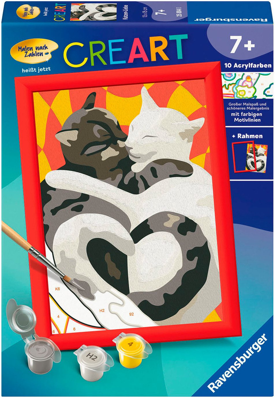 Farbige Motivlinien: Größerer Malspaß & ein schöneres Ergebnis! Dank der farbigen Motivlinien, können die Kinder das ganze Motiv Katzen-Liebe und die Farben schneller erkennen. Der Pinsel hat eine gute Führung und so entsteht ein perfektes Bild. Die schönen Motive zum Ausmalen sind eine tolle Geschenkidee für Kinder ab 7 Jahren und eine schöne Dekoration. In diesem Malset sind bereits 10 fertig gemischte Acrylfarben enthalten. Verpackungsdesign kann abweichen. Mit Malen nach Zahlen von Ravensburger lernen die Kinder Flächen sorgfältig auszumalen, ihr Maltalent zu verbessern sowie feinmotorische Fähigkeiten zu entwickeln. Am Ende stehen Freude, Stolz und ein Erfolgserlebnis, das die Lust am Впередmalen weckt. Die Motive sind altersgerecht in drei Schwierigkeitsstufen umgesetzt: von einfachen Bildern mit wenigen, großen Malflächen bis hin zu Bildern mit vielen, kleinen Malflächen für Fortgeschrittene. Jedes Malset enthält alles, was Künstler zum Malen brauchen und es ist kein Mischen der Farben notwendig. Das Ravensburger Malen nach Zahlen Programm bietet eine große Motivauswahl für Kinder und Erwachsene.