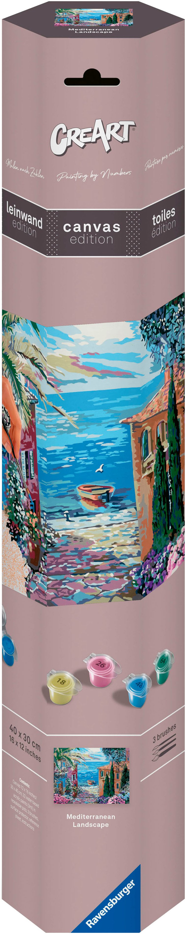 CreArt Malen nach Zahlen von Ravensburger für Erwachsene gibt es jetzt auch auf hochwertiger Leinwand! Malen nach Zahlen für Erwachsene ab 14 Jahren macht auf der hochwertigen Leinwand im Format 40 cm x 30 cm besonders großen Spaß und sorgt für pure Entspannung. Die Leinwand zum Ausrollen ist mit Motivlinien bedruckt und nummeriert und wird mit den bereits fertig gemischten Acrylfarben ausgemalt. Die neue, moderne und platzsparende Verpackung enthält alles, was zum Malen benötigt wird. Bewährte Ravensburger Qualität im neuen Look! - Mit unseren All-in One Sets zur inneren Ruhe und Entspannung finden - Drei Pinsel in verschiedenen Stärken machen das Ausmalen flexibel - Die praktische Malunterlage dient als Schutz der Leinwand und des Maltisches oder zum Ausprobieren der Farben - Fühle dich beim Ausmalen wie im Urlaub mit dem wunderschönen Motiv Leinwand Mediterrane Landschaft. So einfach war malen noch nie! - Das Motiv Leinwand Mediterrane Landschaft ist auch für Malen nach Zahlen Einsteigerinnen & Einsteiger geeignet