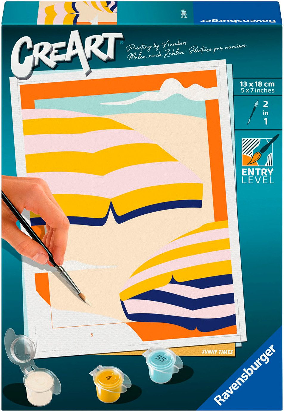 Lieferumfang | 1 Maltafel (Format 13x18 cm) 1 Qualitätspinsel 7 Acrylfarben auf Wasserbasis in wiederverschließbaren Näpfchen Bildaufhänger Farbpalette Vorlageblatt und Anleitung |