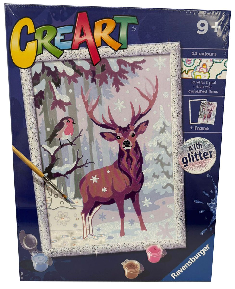 Hersteller: CreArt Herstellerteilenummer: 20078 Charakter: Malen nach Zahlen Motiv: Hirsch und Rotkehlchen Set enthält: 1 x Malleinwand, 10 Acrylfarben, 1 x Staffelei, 1 x Pinsel, 1 x Anleitungsblatt, 1 x Präsentationsrahmen Material: Kunststoff / Pappe Lieferumfang: 1 CreArt Mal-Set Altersempfehlung des Hersteller: ab 9 Jahren geeignet.