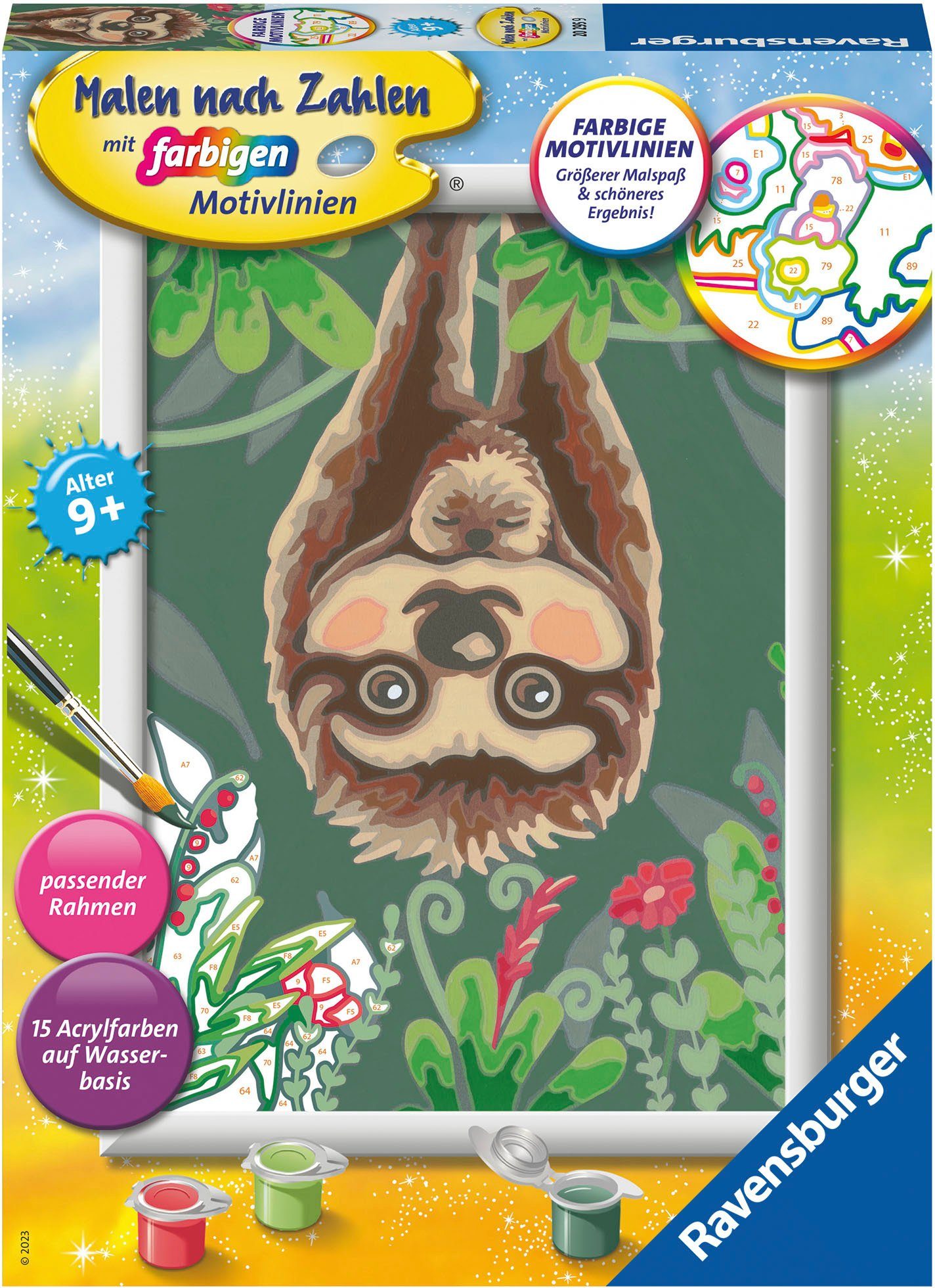 Farbige Motivlinien: Größerer Malspaß & ein schöneres Ergebnis! Dank der farbigen Motivlinien, können die Kinder das ganze Motiv Faultier-Liebe und die Farben schneller erkennen. Der Pinsel hat eine gute Führung und so entsteht nach und nach ein perfektes Bild. Die schönen Motive zum Ausmalen sind eine tolle Geschenkidee für Kinder ab 9 Jahren und eine schöne Dekoration für das Kinderzimmer. In diesem Malset sind bereits 15 fertig gemischte Acrylfarben enthalten. Mit Malen nach Zahlen von Ravensburger lernen die Kinder Flächen sorgfältig auszumalen, ihr Maltalent zu verbessern sowie feinmotorische Fähigkeiten zu entwickeln. Am Ende stehen Freude, Stolz und ein Erfolgserlebnis, das die Lust am Впередmalen weckt. Die Motive sind altersgerecht in drei Schwierigkeitsstufen umgesetzt: von einfachen Bildern mit wenigen, großen Malflächen bis hin zu Bildern mit vielen, kleinen Malflächen für Fortgeschrittene. Jedes Malset enthält alles, was Künstler zum Malen brauchen und es ist kein Mischen der Farben notwendig. Das Ravensburger Malen nach Zahlen Programm bietet eine große Motivauswahl für Kinder und Erwachsene. Inklusive hochwertigem Bilderrahmen.