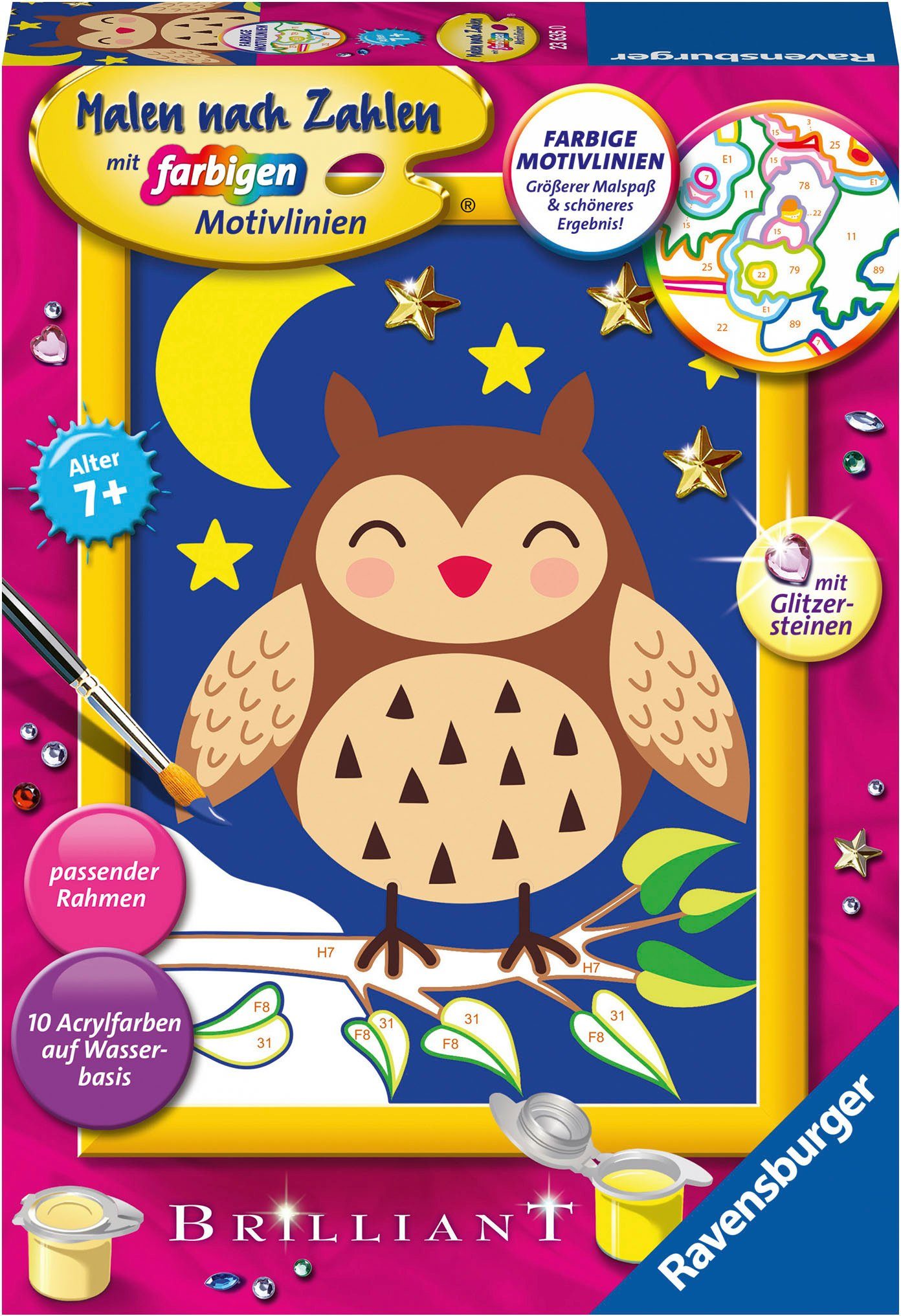 Farbige Motivlinien: Größerer Malspaß & ein schöneres Ergebnis! Dank der farbigen Motivlinien, können die Kinder das ganze Motiv Niedliche Eule und die Farben schneller erkennen. Der Pinsel hat eine gute Führung und so entsteht nach und nach ein perfektes Bild. Die schönen Motive zum Ausmalen sind eine tolle Geschenkidee für Kinder ab 7 Jahren und eine schöne Dekoration für das Kinderzimmer. In diesem Malset sind bereits 10 fertig gemischte Acrylfarben enthalten. Mit Malen nach Zahlen von Ravensburger lernen die Kinder Flächen sorgfältig auszumalen, ihr Maltalent zu verbessern sowie feinmotorische Fähigkeiten zu entwickeln. Am Ende stehen Freude, Stolz und ein Erfolgserlebnis, das die Lust am Впередmalen weckt. Die Motive sind altersgerecht in drei Schwierigkeitsstufen umgesetzt: von einfachen Bildern mit wenigen, großen Malflächen bis hin zu Bildern mit vielen, kleinen Malflächen für Fortgeschrittene. Jedes Malset enthält alles, was Künstler zum Malen brauchen und es ist kein Mischen der Farben notwendig. Das Ravensburger Malen nach Zahlen Programm bietet eine große Motivauswahl für Kinder und Erwachsene. Inklusive Rahmen.