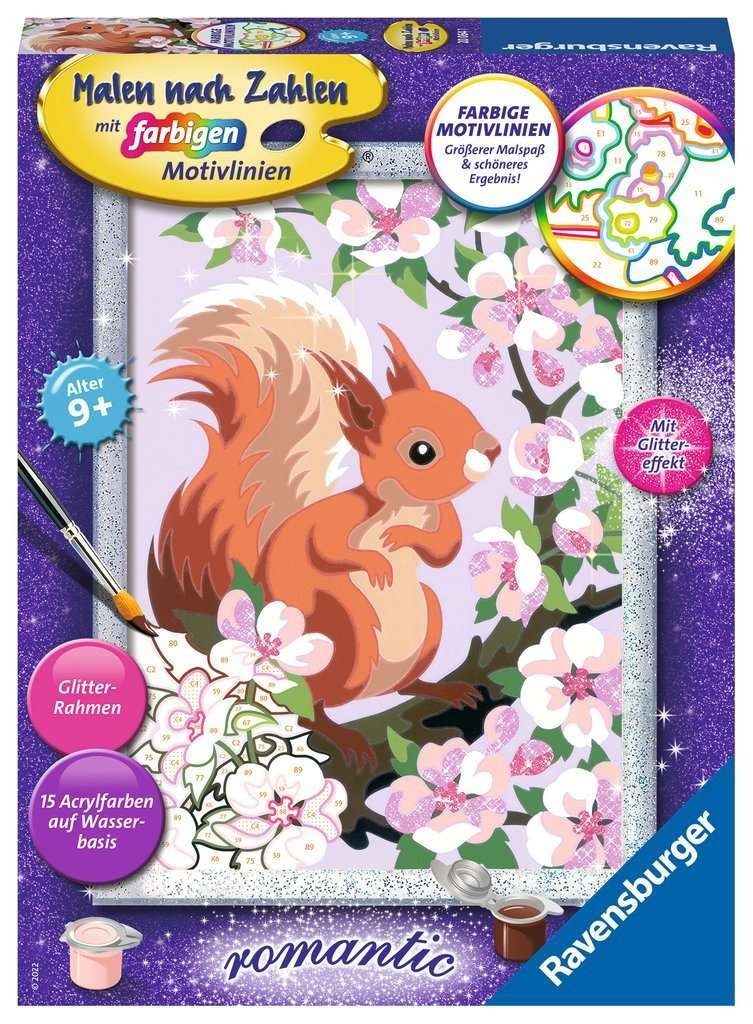 Farbige Motivlinien: Größerer Malspaß & ein schöneres Ergebnis!Dank der farbigen Motivlinien, können die Kinder das ganze Motiv Neugieriges Eichhörnchen und die Farben schneller erkennen. Der Pinsel hat eine gute Führung und so entsteht nach und nach ein perfektes Bild.Die schönen Motive zum Ausmalen sind eine tolle Geschenkidee für Kinder ab 9 Jahren und eine schöne Dekoration für das Kinderzimmer. In diesem Malset sind bereits 15 fertig gemischte Acrylfarben enthalten.Mit Malen nach Zahlen von Ravensburger lernen die Kinder Flächen sorgfältig auszumalen, ihr Maltalent zu verbessern sowie feinmotorische Fähigkeiten zu entwickeln. Am Ende stehen Freude, Stolz und ein Erfolgserlebnis, das die Lust am Впередmalen weckt.Die Motive sind altersgerecht in drei Schwierigkeitsstufen umgesetzt: von einfachen Bildern mit wenigen, großen Malflächen bis hin zu Bildern mit vielen, kleinen Malflächen für Fortgeschrittene.Jedes Malset enthält alles, was Künstler zum Malen brauchen und es ist kein Mischen der Farben notwendig. Zusätzlich zur Maltafel, zu den Farben und zum Pinsel, ist in diesem Malset funkelnder Glitter enthalten. Sobald das Motiv fertig ausgemalt ist, wird der Glitter angemischt und aufgetragen. So entsteht wird das Motiv zum Glitzern gebracht.Das Ravensburger Malen nach Zahlen Programm bietet eine große Motivauswahl für Kinder und Erwachsene.