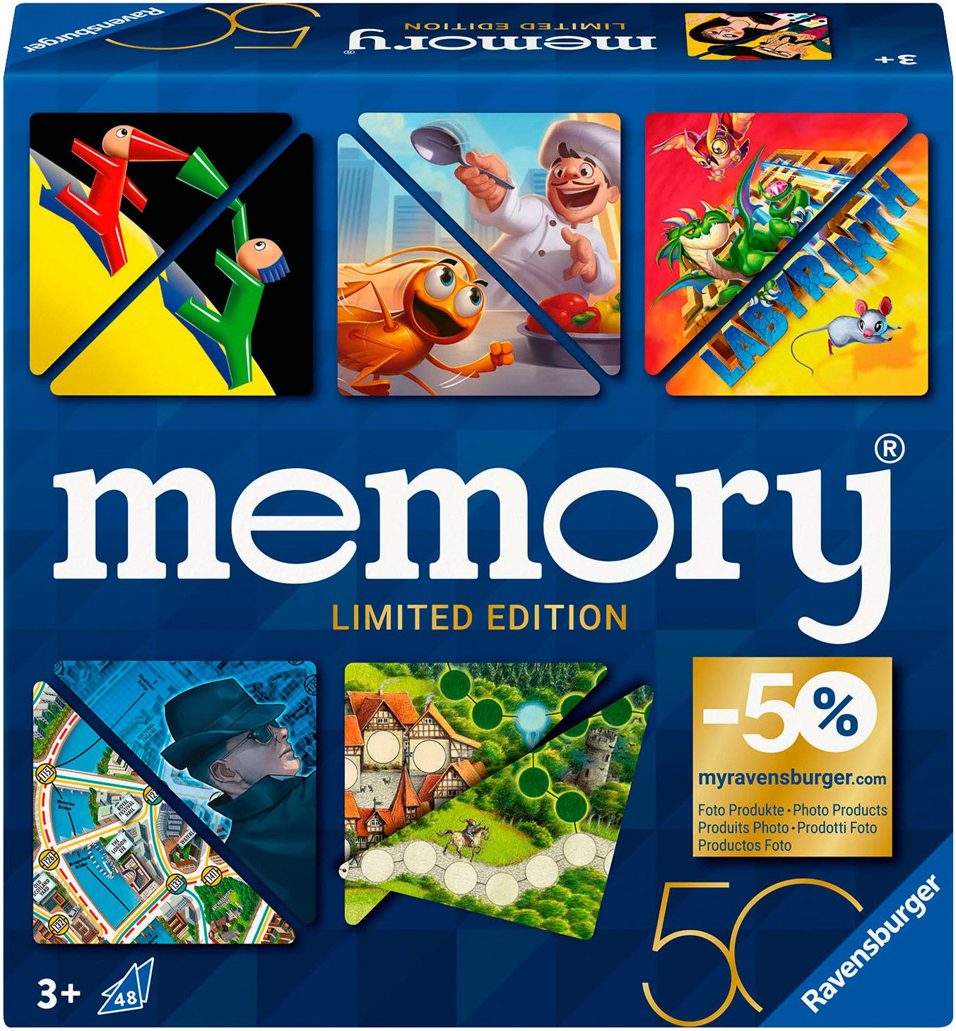 Ravensburger feiert den 50. Geburtstag des blauen Dreiecks und lädt zu einer Reise in die umfangreiche Produktwelt des Verlags ein. Ziel des Spiels ist es, die meisten Paare zu finden. Beim memory® 50 Jahre Blaues Dreieck werden jedoch nicht identische Bilder gesucht, sondern immer zwei Dreiecke, die zum selben Produkt gehören und zum Quadrat zusammengelegt einen Ravensburger Artikel zeigen. Malefiz, Fang den Hut oder Kakerlakak? Wer die meisten zusammengehörenden Kartenpaare findet, gewinnt. 50 Jahre blaues Dreieck! Den runden Geburtstag der bekannten Marke feiert Ravensburger unter anderem mit der Sonderedition memory® 50 Jahre Blaues Dreieck. Passend dazu sind die Karten als Dreiecke gestanzt, die zusammengelegt wiederum das für memory® bekannte Quadrat ergeben. Anstatt identische Bilder werden hier Bildpaare des gleichen Produkts gesucht. Gefunden werden müssen zum Beispiel die beiden zusammengehörenden Dreiecke zu Fang den Hut, Labyrinth oder Scotland Yard. Der beliebte Gedächtsnisspiel-Klassiker memory® macht Spaß und fördert spielerisch das Gedächtnis, die Konzentration und die Merkfähigkeit. Die einfachen Spielregeln machen es zu einem perfekten Familienspiel für viele spannende Spielerunden. Das blaue Dreieck von Ravensburger steht für Qualität, Freude, Bildung und Gemeinsamkeit und inspiriert zu wertvollen gemeinsamen Momenten zwischen Kindern, Familie und Freunden.