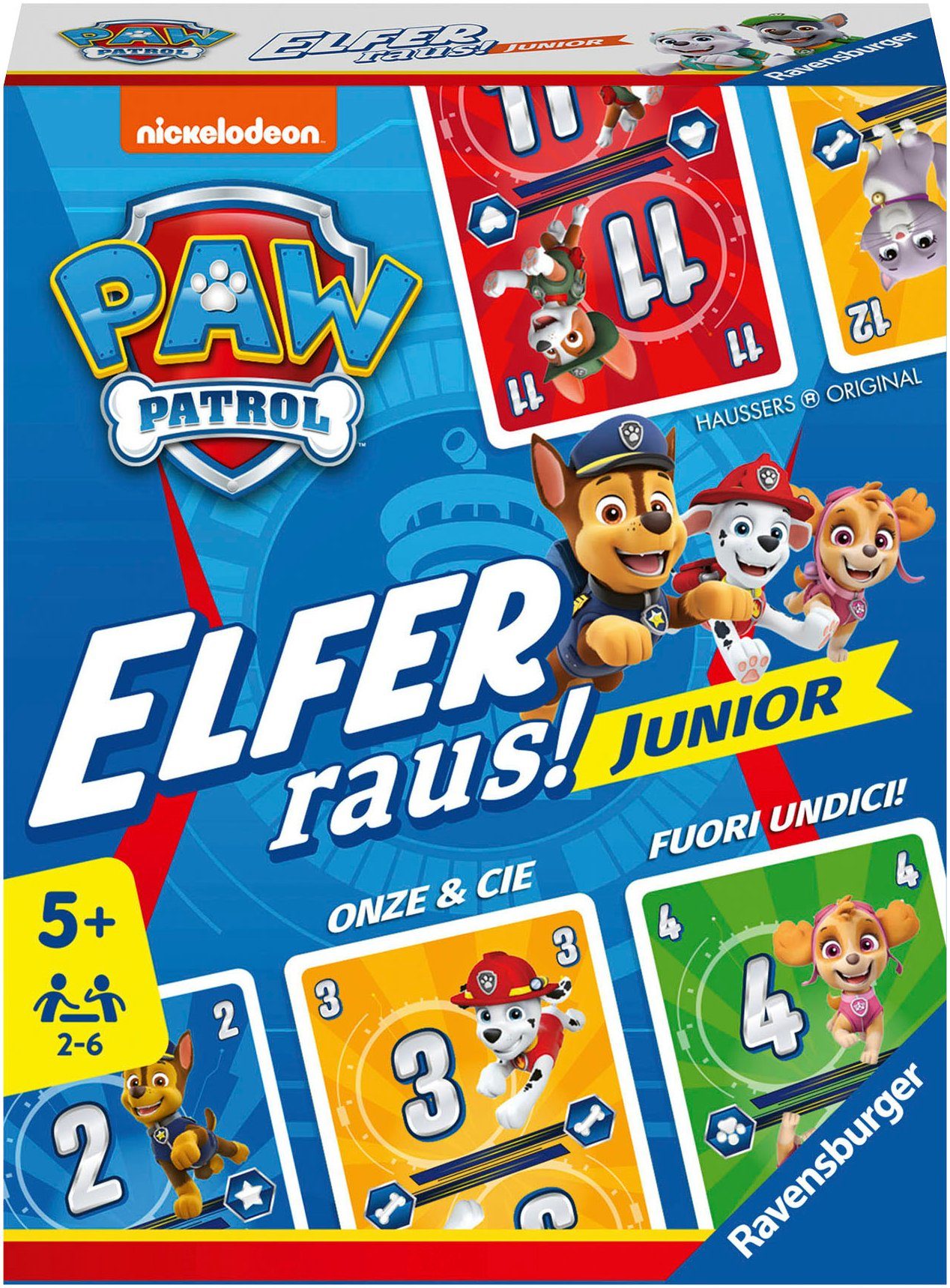 Den beliebten Spielklassiker in der Junior-Version ab 5 Jahren gibt es jetzt mit PAW Patrol, den Helfern auf vier Pfoten. Mit einfachen Einstiegsregeln und dem farbenfrohen Design mit den Fellfreunden, Chase, Marshall, Skye und vielen mehr, gelingt es jeder Familie von 2-6 Personen leicht ins Spielerlebnis einzutauchen. Все versuchen möglichst schnell ihre Handkarten loszuwerden. Angelegt wird farblich passend in einer der vier Zahlenreihen. Wer zuerst alle seine Karten ablegt, gewinnt. Bei diesem Kartenspiel für Kinder und Erwachsene braucht man nicht nur nur Glück! Elfer raus! Junior enthält auch ein taktisches Element: Man kann eine Karte, die man eigentlich ausspielen könnte, zurückhalten, um andere Spieler mit niedrigeren oder höheren Zahlen der gleichen Farbe zu blockieren. Spielende brauchen also nur drei Sachen für Gemeinschaftsspiele wie diese: Platz, Freunde und ein bisschen Taktik. Der besondere Clou: Mit den Karten lassen sich außerdem weitere verschiedene Spielvarianten und sogar das original Elfer raus! spielen.