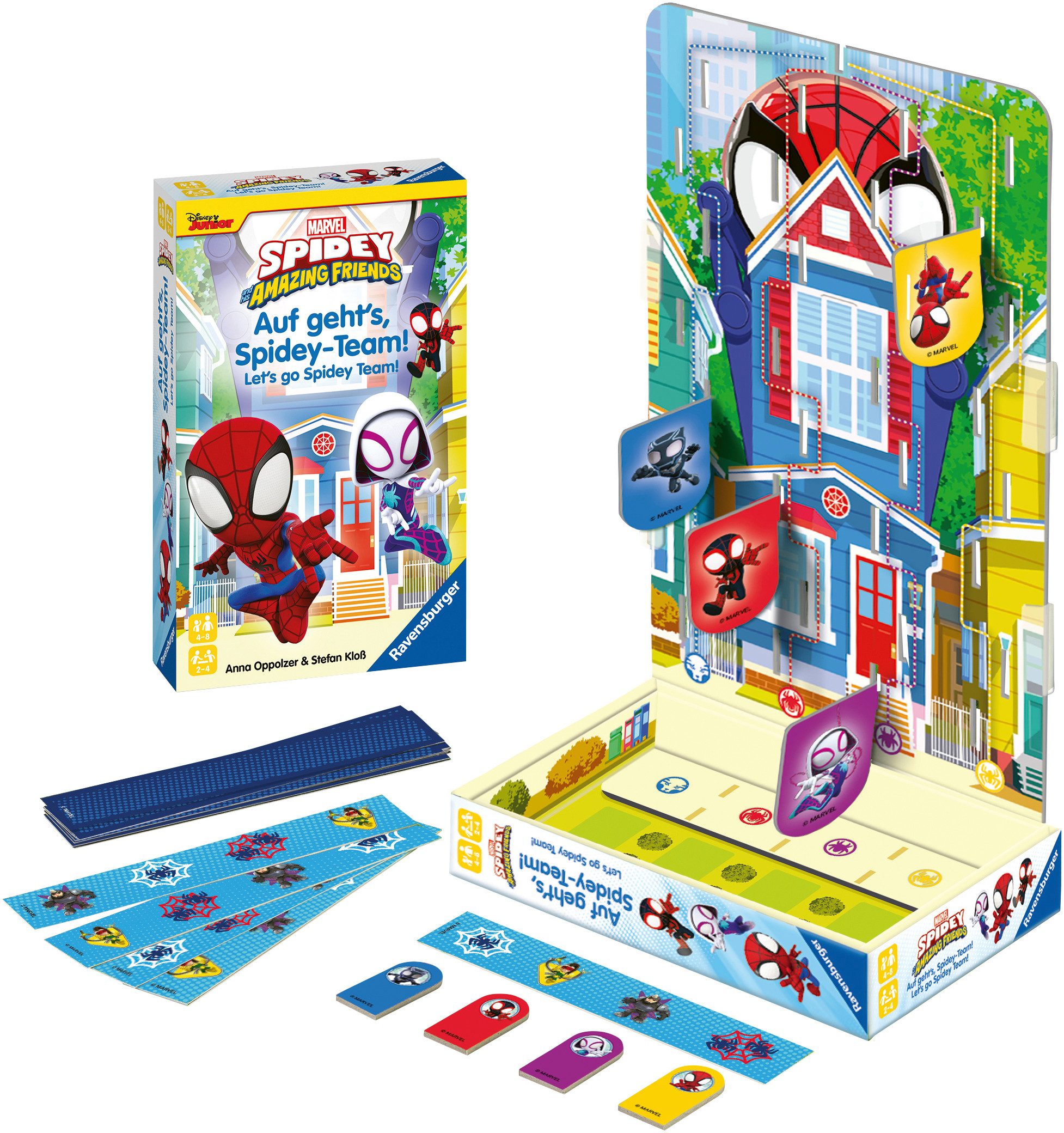 Spidey und seine außergewöhnlichen Superhelden-Freunde aus der Animationsserie "Spidey and his Amazing Friends" klettern um die Wette. Senkrecht geht es das Web-Quartier hinauf! Jeder sucht sich zu Spielbeginn seinen Lieblingshelden aus, doch in jedem Zug bewegen die Spieler immer alle Spielfiguren. Die Kletter-Streifen geben vor, wie geklettert wird. Glück aber auch taktische Überlegungen spielen eine Rolle und verhelfen zum Schluss zum Sieg. Tempo, ihr Superhelden! Wer erreicht das Dach als Erster? Die Animationsserie Spidey and his Amazing Friends zeigt die Abenteuer von Spidey und seiner heldenhaften Freunden Spin und Ghost-Spider. Verstärkung bekommen die Drei von Black Panther, Ms. Marvel und Hulk. Gemeinsam kämpfen sie gegen die Bösewichte und helfen Menschen in Not. Aber auch Helden haben mal Freizeit und messen gerne ihre Kräfte. In diesem Spiel klettern Spidey, Spin, Ghost Spider und Black Panther um die Wette und hangeln sich senkrecht das Web-Quartier hoch. Auf die Plätze, fertig, los! Wer entscheidet den Sieg für sich? Jeder Spieler hat sich zwar zu Beginn für einen Superhelden entschieden, doch werden in jedem Zug immer alle vier Spielfiguren fortbewegt. Die Vorgabe dazu machen die Kletterstreifen, die in zwei Richtungen gelegt werden können. Welche Ausrichtung nützt welcher Spielfigur am meisten? Wer ist super schnell und sichert sich als Erster den Platz auf dem Dach?
