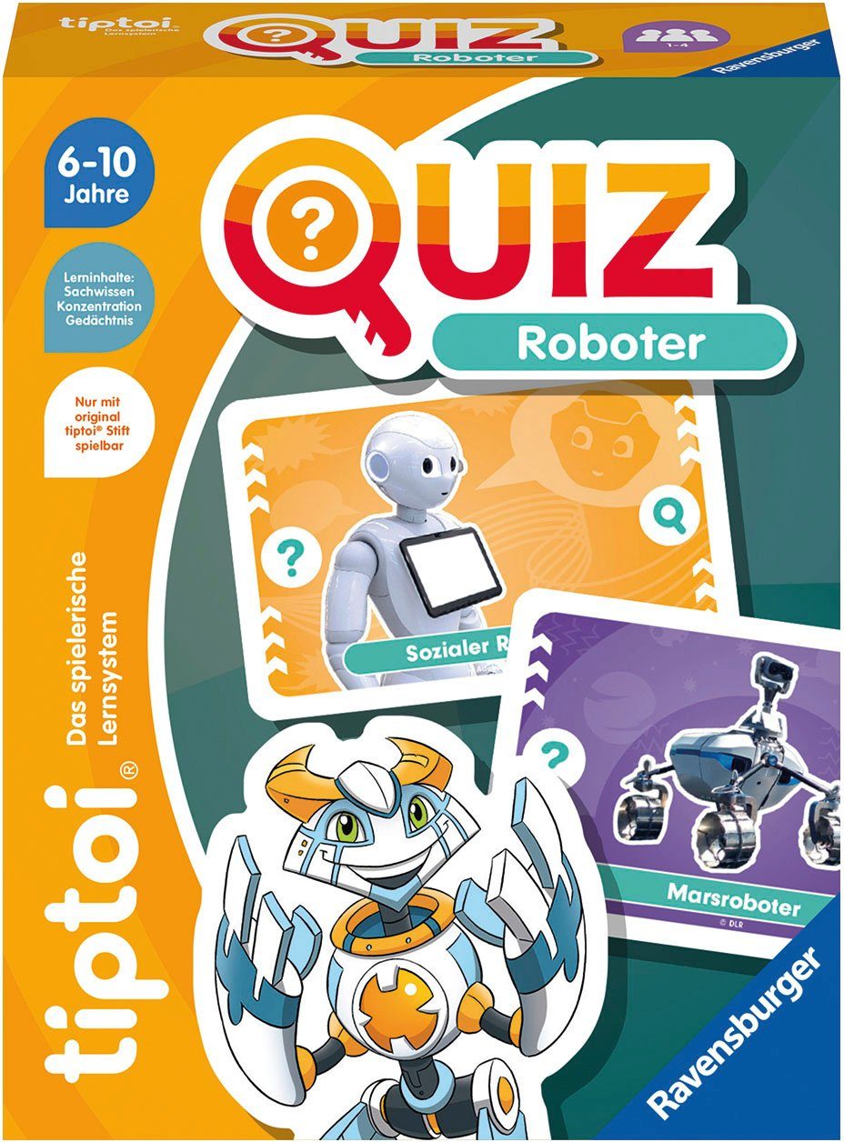 Auf der Insel Quizamui veranstalten die lustigen Quiz-Tiere regelmäßig ein Quiz-Turnier. Beim Quiz Roboter nehmen die Kinder an einem dieser Turniere teil. Dabei beantworten sie Fragen rund um das Thema Roboter: Was ist ein Roboter? Welche Roboter gibt es? Und wie funktioniert ein Staubsaugerroboter? Aber Achtung: Die frechen Quiz-Tiere stellen ganz schön kniffelige Fragen. Wer zuerst das Super-Quiz-Tier erreicht und drei besonders schwierige Fragen beantwortet, gewinnt das Spiel. Quiz Roboter ist ein spannendes und kompetitives Quiz-Kartenspiel. Die Kinder messen sich in einem Wettlauf zum Super-Quiz-Tier. Wer eine Frage richtig beantwortet, darf zur nächsten Karte vorrücken und ist dem Ziel einen Schritt näher. Wer falsch antwortet, erhält als Ausgleich eine Joker-Karte, die in der nächsten Runde hilft, die kniffeligen Quiz-Fragen zu beantworten. Ganz nebenbei lernen sie spielerisch viele wichtige Fakten über Roboter. tiptoi ist ein innovatives Lern- und Kreativsystem, mit dem Kinder die Welt spielerisch entdecken. Tippt man mit dem Stift auf ein Bild oder einen Text, erklingen passende Geräusche, Sprache oder Musik. Das Меню umfasst Bücher und Spiele mit den wichtigsten Lern- und Wissensthemen für Kinder ab 2 Jahren. Die zugehörigen Audiodateien lädt man einfach, sicher und schnell über den tiptoi-Manager auf den Stift. tiptoi-Stift nicht enthalten. Muss separat erworben werden.