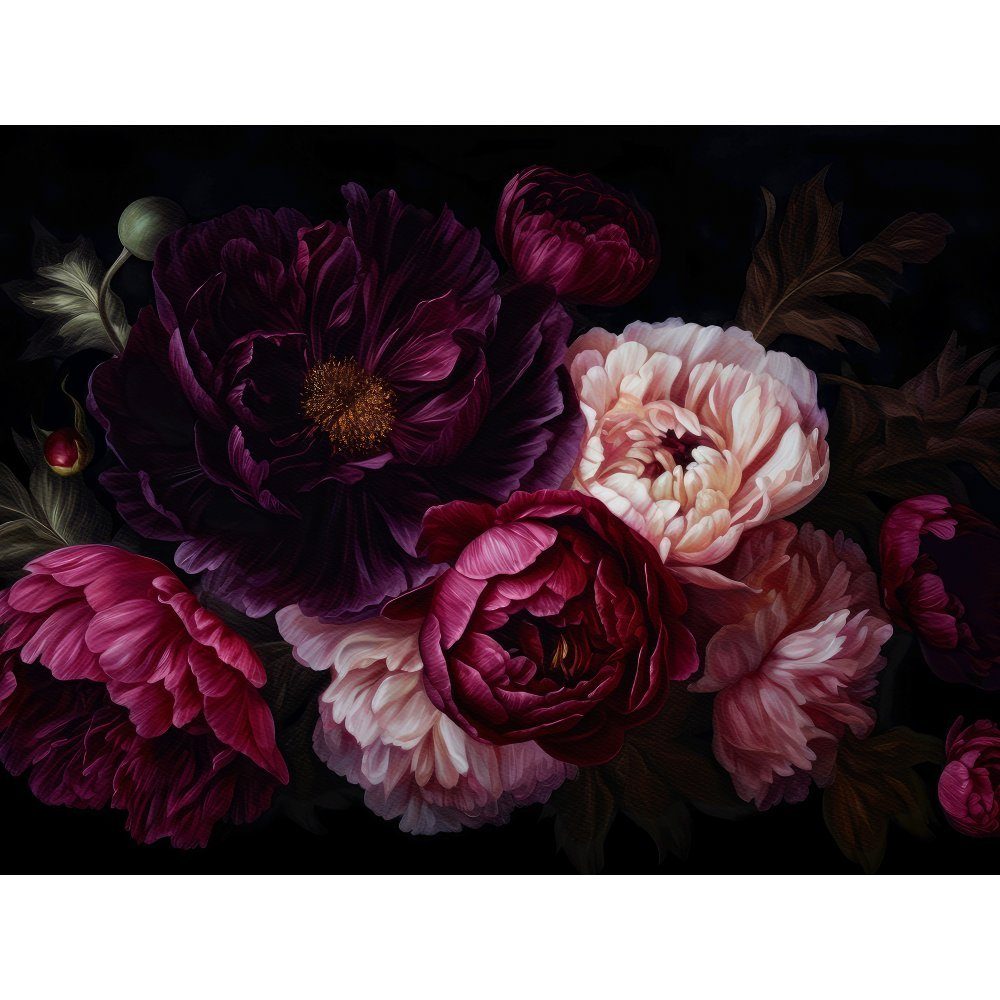 In diesem nostalgischen Gothic-Floraldesign sind üppige Pfingstrosen und dunkelrote Rosen kunstvoll zu einem prächtigen Blumengesteck arrangiert. Die dunklen Blüten stehen in starkem Kontrast zu dem mysteriösen, fast schwarz wirkenden Hintergrund und verleihen dem Arrangement eine geheimnisvolle Tiefe. Dieses luxuriöse und romantische Blumengesteck erinnert an vergangene Zeiten, in denen Blumenarrangements als Ausdruck von Pracht und Sinnlichkeit galten. Die üppigen Blüten, insbesondere die Rosen, symbolisieren die tiefe Schönheit und Leidenschaft, die mit der Gothic-Ästhetik und der romantischen Vergangenheit verbunden sind. Dieses Design schafft eine elegante und faszinierende Atmosphäre, die den Raum mit einer nostalgischen Anziehungskraft erfüllt und die düstere Romantik der Blumen in den Vordergrund stellt.