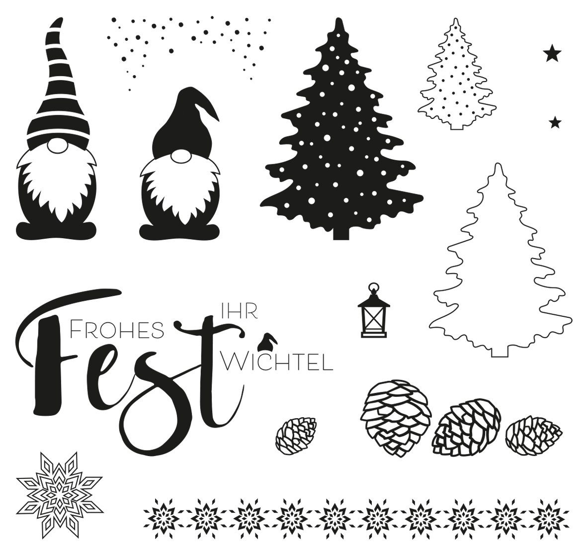 Tolle Clear Stamps 'Wichtelweihnacht' mit einer Motivgröße von ca. 0,5 cm bis 7,5 cm. Mit diesen Motivstempeln können Adventskalender, Grußkarten, Holzboxen, Pappschachteln, Geschenkanhänger, Stoffsäckchen, Papiertüten oder Scrapbook-Projekte wundervoll gestaltet und verziert werden. Lassen Sie Ihrer Kreativität freien Lauf. Klasse in Kombination mit weiteren Stempeln.