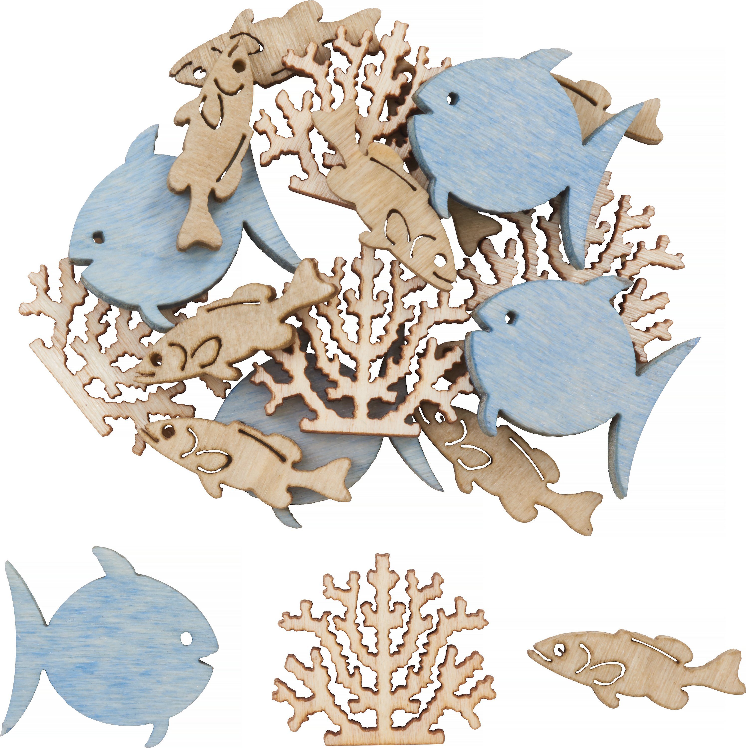 Streuteile Fisch und Koralle 'Koffi', 20 Stück aus Holz mit einer Размер von ca. 2 cm und einer Stärke von ca. 3 mm. Für maritime Dekorationen auf Tabletts oder Windlichtern. Auch als Streudeko für den Tisch oder für die Kartengestaltung ideal. Schleifenbänder, Kordeln, Deko-Sand, Muscheln und maritime Miniaturen runden die Dekoration ab.