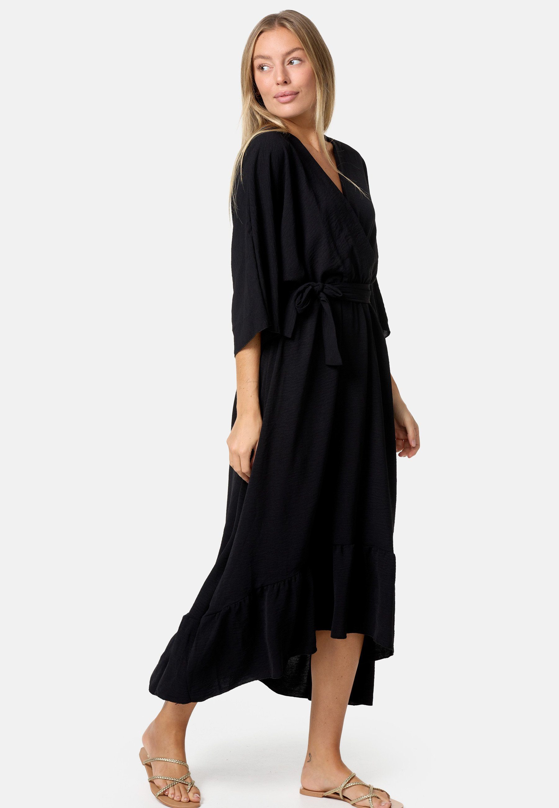 Romantisches, langes Damen Maxi Kleid mit V-Ausschnitt in Kimono Wickeloptik und breiter Rüsche am Rock. Das Kleid ist in weit geschnittener A-Linie gehalten mit einem asymmetrisch gearbeiteten Rock (hinten länger als vorne). Der Kimono Look des Oberteils wird durch den Ausschnitt in Wickeloptik und die halblangen, weiten Ärmel verstärkt. Ein breiter Schleifengürtel mit Schlaufen über dem Taillengummizug ist ein verspielter Blickfang und bringt gleichzeitig das Kleid weiter auf Figur für optimalen Tragekomfort.