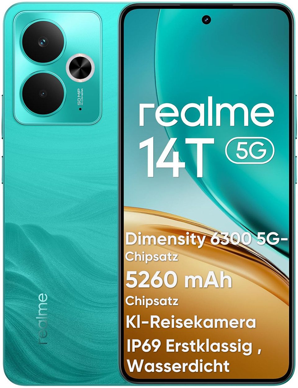 Das Realme 14T mit 6,67 Zoll Display ist dein Begleiter in allen Lebenssituationen, egal ob zum Surfen, Chatten, Fotos und Videos machen oder Spielen. Auch bei mehreren parallel laufenden Apps kommen der sehr schnell arbeitende 2,4 GHz Octa-Core-Prozessor Dimensity von Mediatek und der große 8 GB Arbeitsspeicher nicht ins Schwitzen. Bis zu 54 Stunden reine Gesprächszeit (4G) leistet der fest eingebaute Akku mit einer hohen Akkukapazität von 6000 mAh. Du suchst ein Smartphone mit besonders großem Display, das eine gute Akkulaufzeit hat, in puncto Sicherheit auftrumpfen kann und schnelles WLAN5G bietet? Dann könnte dieses Modell eine gute Wahl für dich sein.